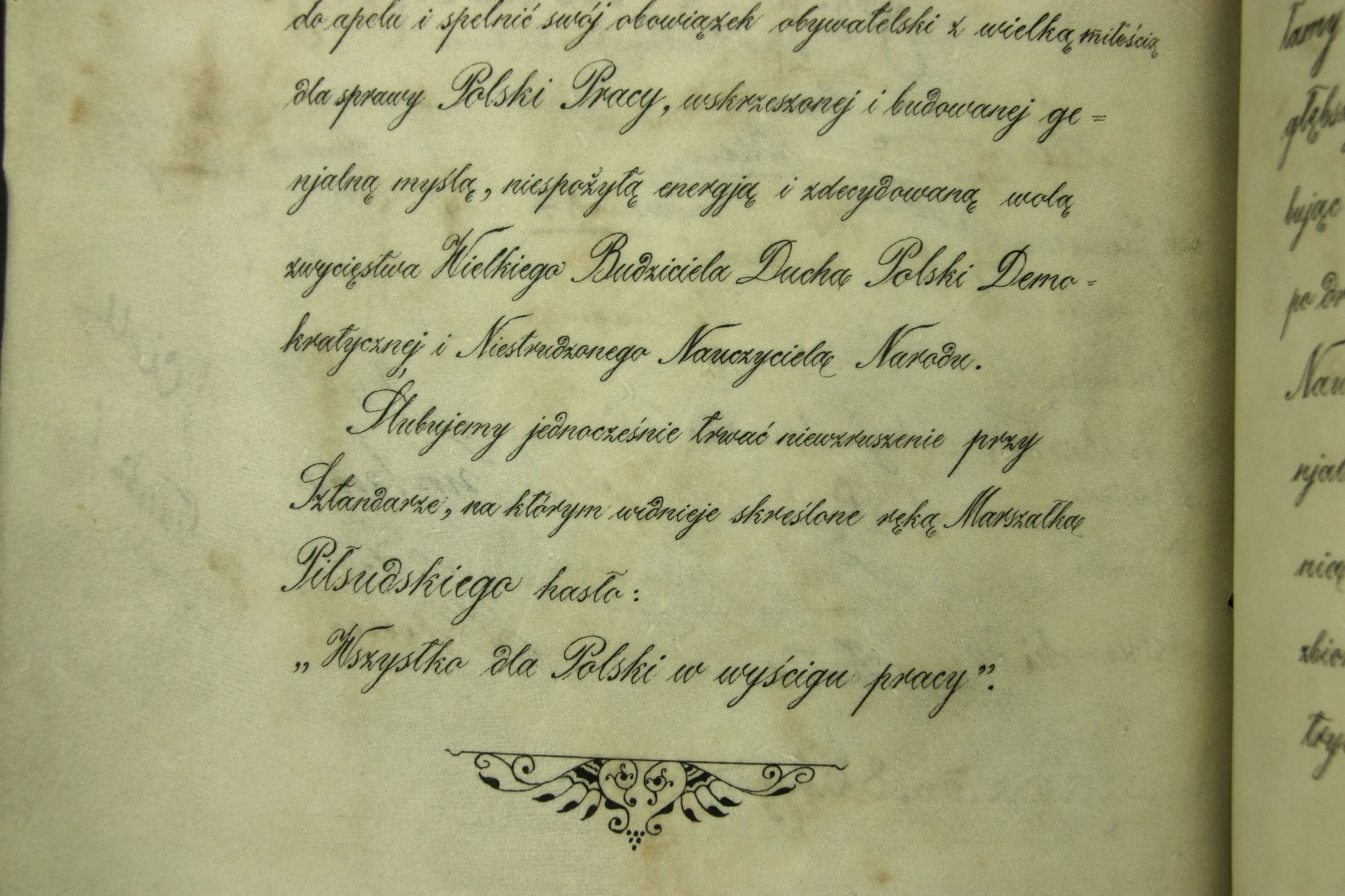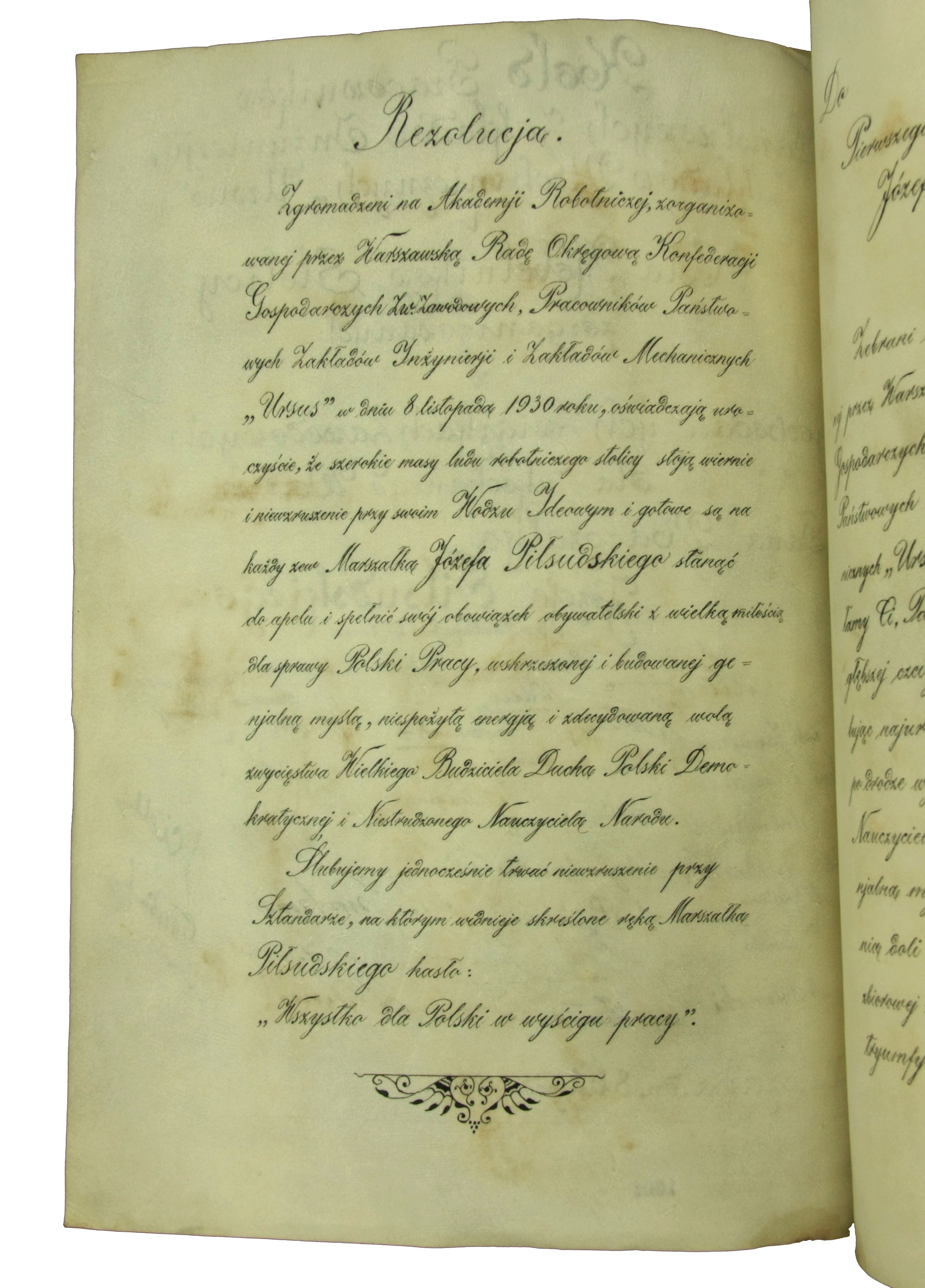 Uroczysta rezolucja pracowników P.Z.Inż., Zakładów Ursus do marszałka Józefa Piłsudskiego 8 listopada 1930 r. Pergamin. Wym. 30 x 44 cm. 4 strony.