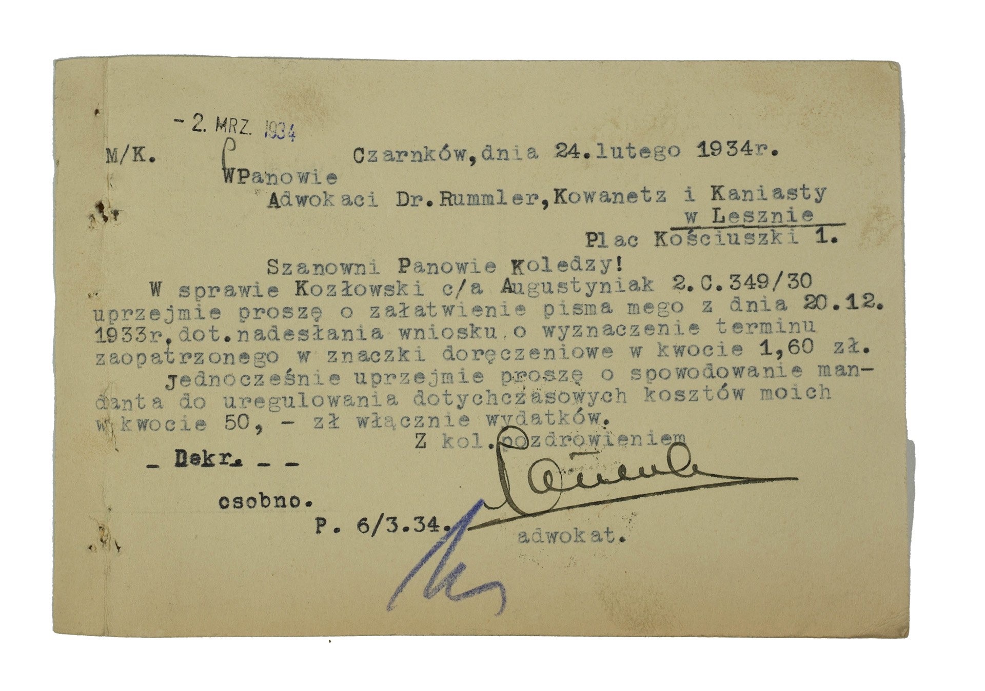 Kazimierz Rankowski adwokat CZARNKÓW Rynek nr 8 - pocztówka z nagłówkiem reklamowym, f. 15,8 x 10,5cm