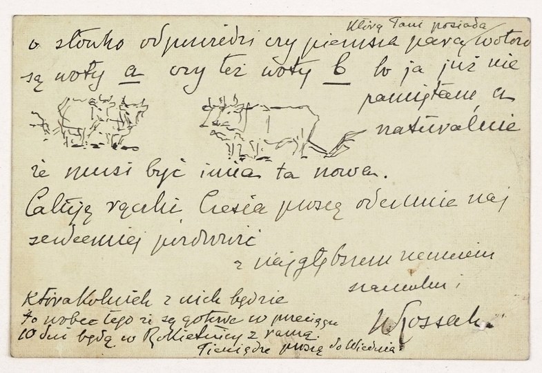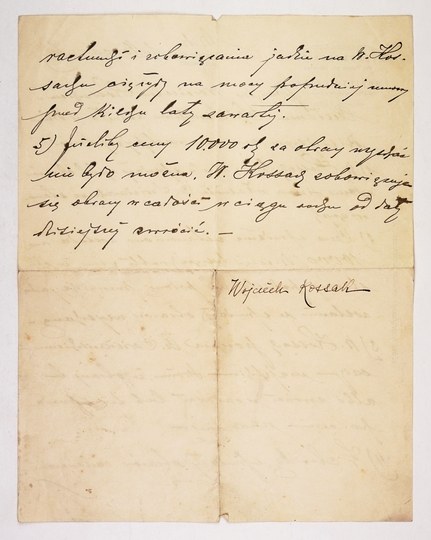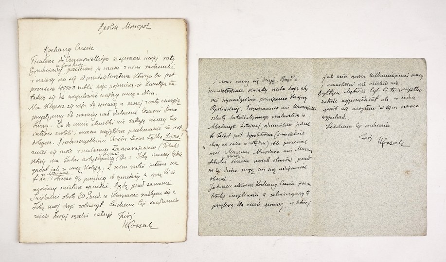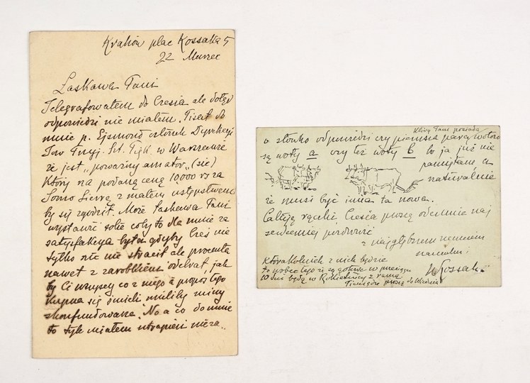 5. dwa listy W. Kossaka do Zofii Świeżawskiej, żony Czesława, oba dwustronicowe. W jednym informuje, że w Warszawie jest klient gotów zapłacić 10.000 koron „z małym ustępstwem”, martwi go milczenie korespondencyjne Świeżawskiego, wspomina o gotowych ramach do obrazów „u Sapiehy w Warszawie”. Drugi list dotyczy głównie obrazu zamówionego przez Świeżawską i zawiera rysunek dwóch par wołów, do wyboru. Artysta gotów jest namalować obraz po niższej cenie, aby „zatrzeć niemiłe wrażenia z mojej współki z Czesiem”. Załamania narożnika jednego listu, stan dobry