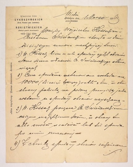 1. dwie umowy pomiędzy C. Świeżawskim i W. Kossakiem z 23 II 1901 w Warszawie i 1 III 1903 w Wiedniu, obie podpisane przez Wojciecha Kossaka (umowa wcześniejsza z ubytkiem narożnika i przetarciem na zgięciach, późniejsza spisana na papierze firmowym Świeżawskiego jako właściciela dóbr łykoszyńskich i rokietnickich)