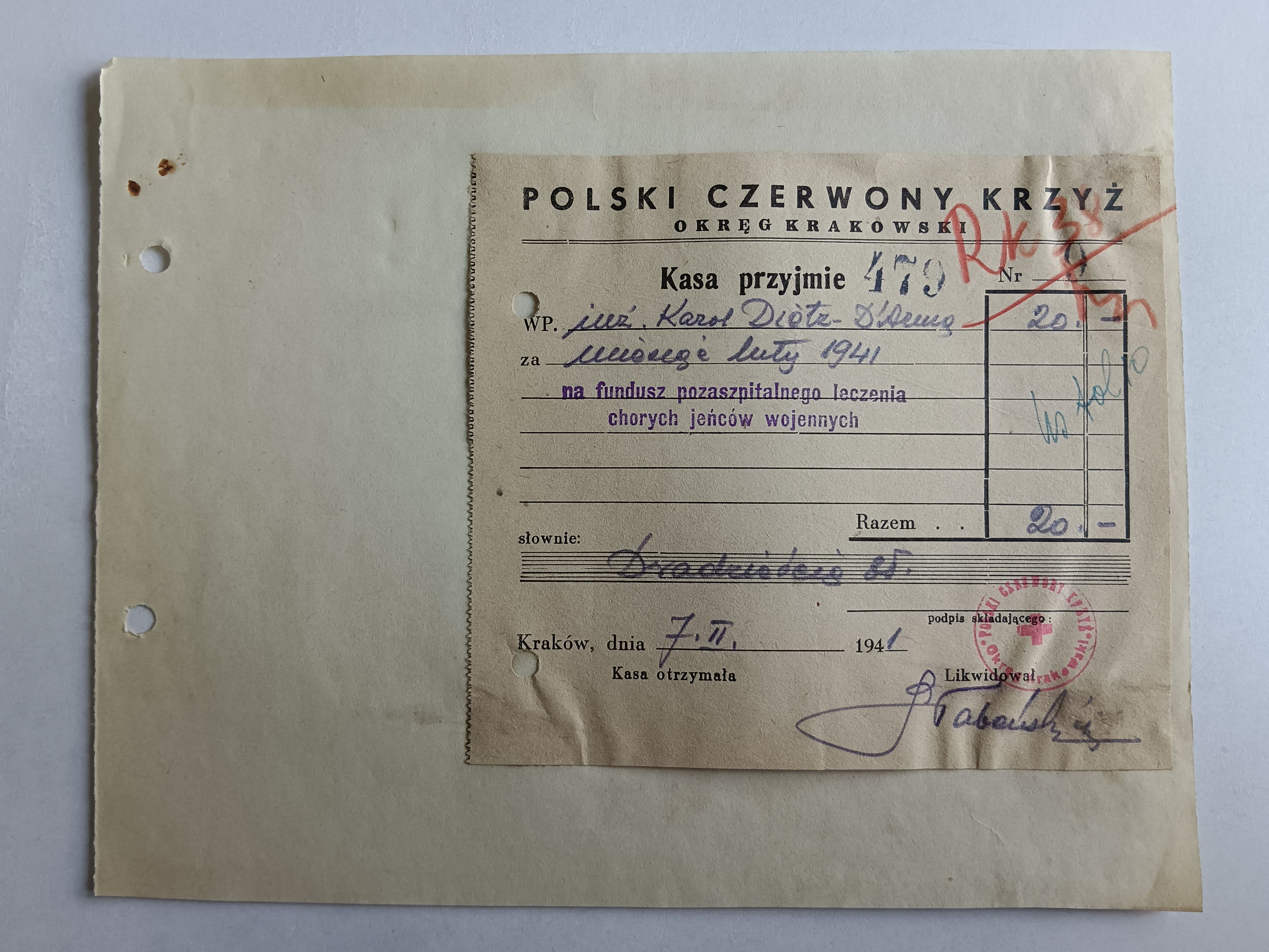 KRAKÓW POLSKI CZERWONY KRZYŻ PCK RACHUNEK, FUNDUSZ POZASZPITALNE LECZNIE JEŃCÓW WOJENNYCH 1941 R, PIECZĄTKA