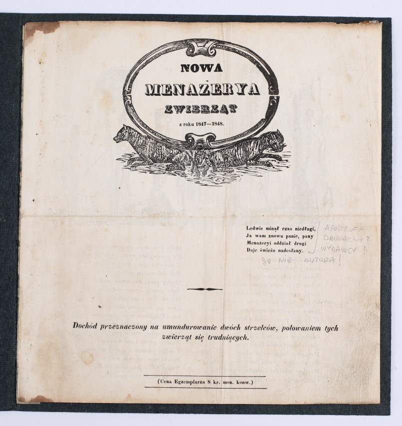 [KROCZYŃSKI Dyonizy] Nowa Menażerya zwierząt z roku 1847-1848. Dochód przeznaczony na umundurowanie dwóch strzelców, polowaniem tych zwierząt się trudniących. Lwów 1848. Druk Instytutu Ossolińskich.
