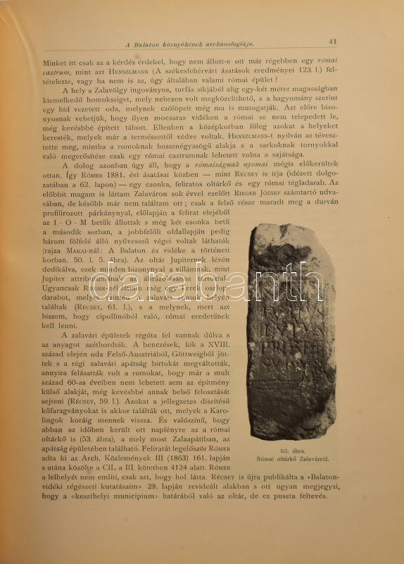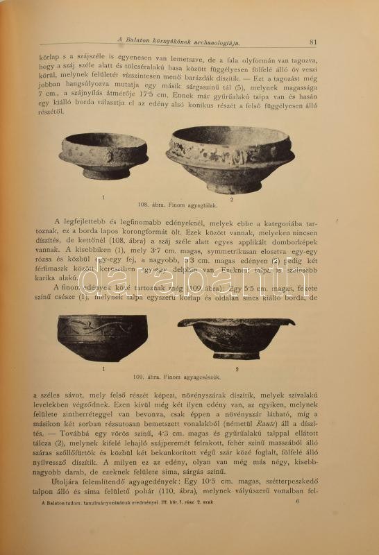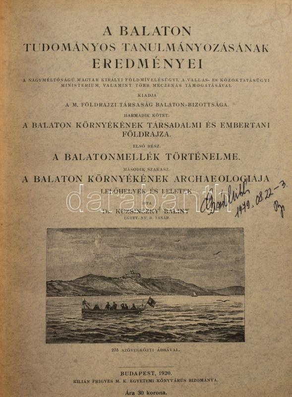 Kuzsinszky Bálint: A Balaton környékének archaeologiája. Lelőhelyek és leletek. Kiadja: Magyar Földrajzi Társaság Balaton-Bizottsága. A Balaton tudományos tanulmányozásának eredményei. III. kötet: A Balaton környékének társadalmi és embertani földrajza 1. rész: A Balatonmellék történelme. II. szakasz. Bp., 1920, Kilián Frigyes, (Hornyánszky-ny.). XVI+220 p. 235 szövegközti képpel, ábrával. Bekötött papírborítókkal. Átkötött félvászon-kötés, címlapon kis hiánnyal, névbejegyzéssel, jó állapotban.