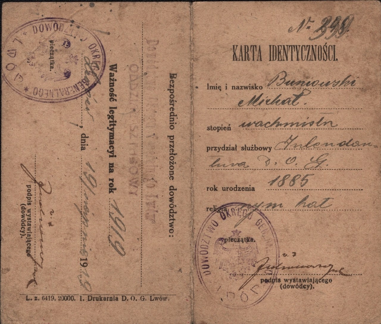 [Dowództwo Okręgu Generalnego Lwów] Karta identyczości wydana dla wachm. Michała Buniowskiego. Lwów 19 VIII 1919 r.