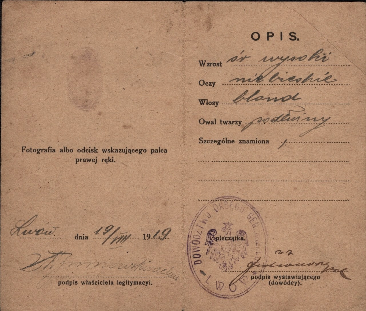 Pieczęć - Dowództwo Okręgu Generalnego Lwów. Podpis nieznanego oficera w. z. oraz odcisk wskazującego palca prawej ręki właściciela legitymacji.