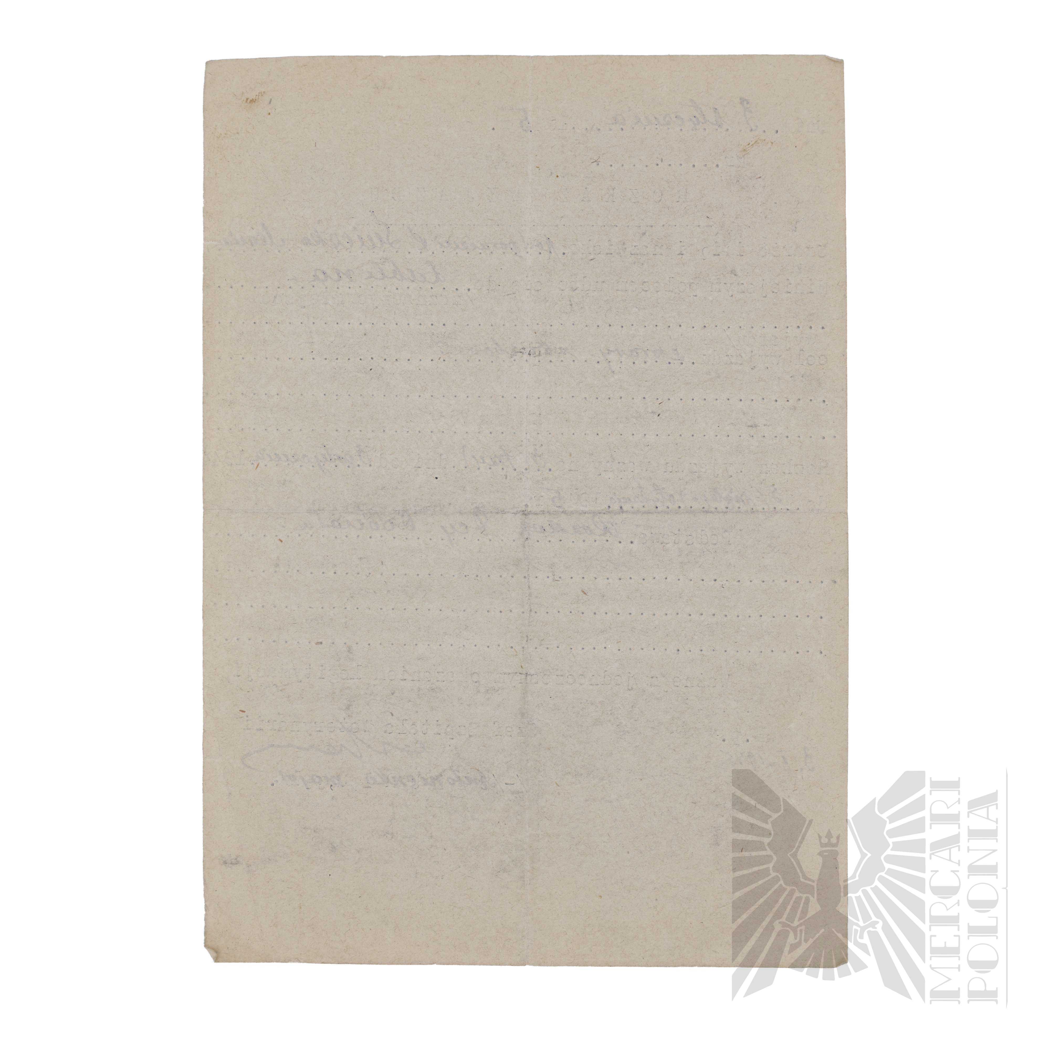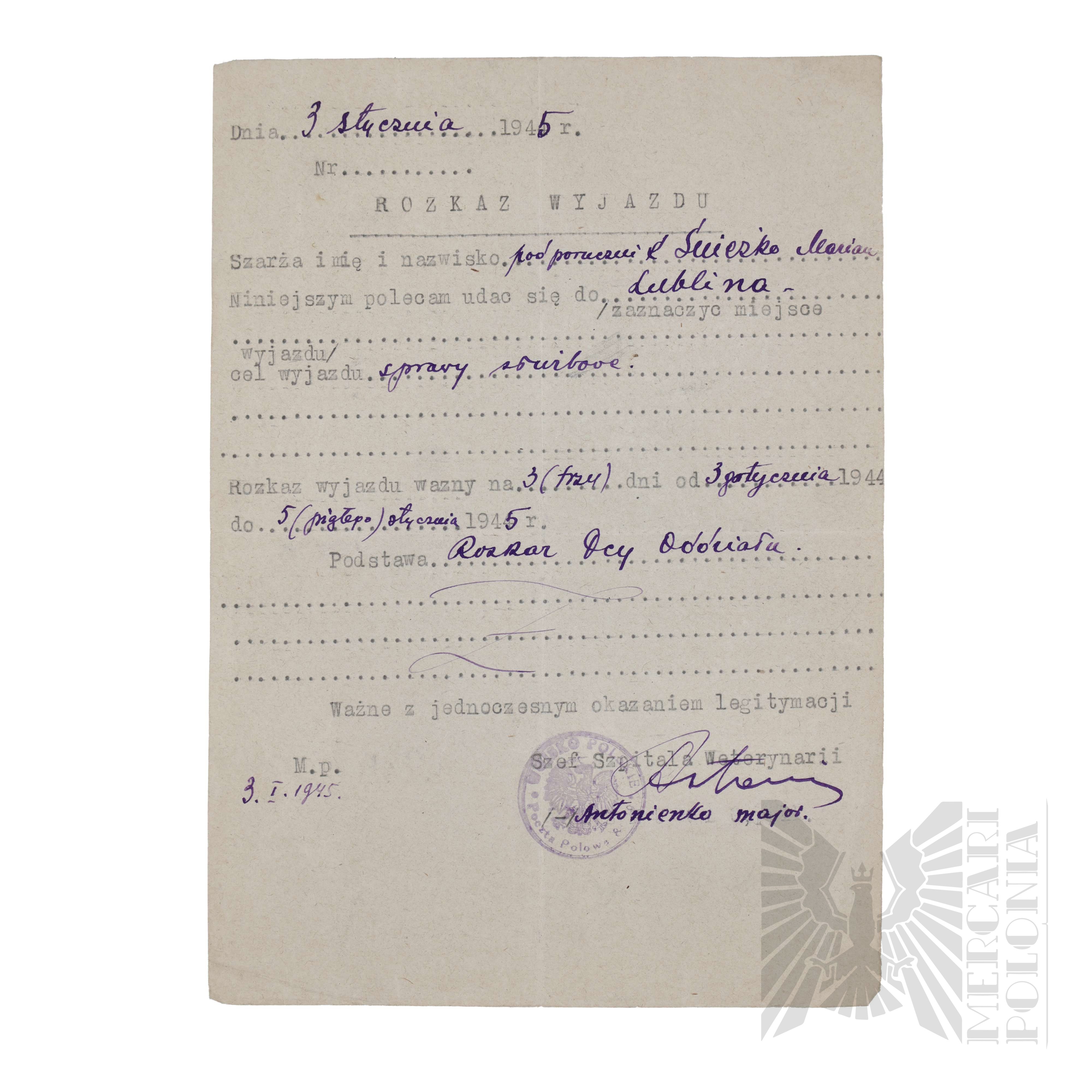 Dokument Rozkaz Wyjazdu z Podpisem Szefa Szpitala Weterynarii wydany 3 stycznia 1945 roku w sprawach służbowych do Lublina do 5 stycznia 1945 roku.