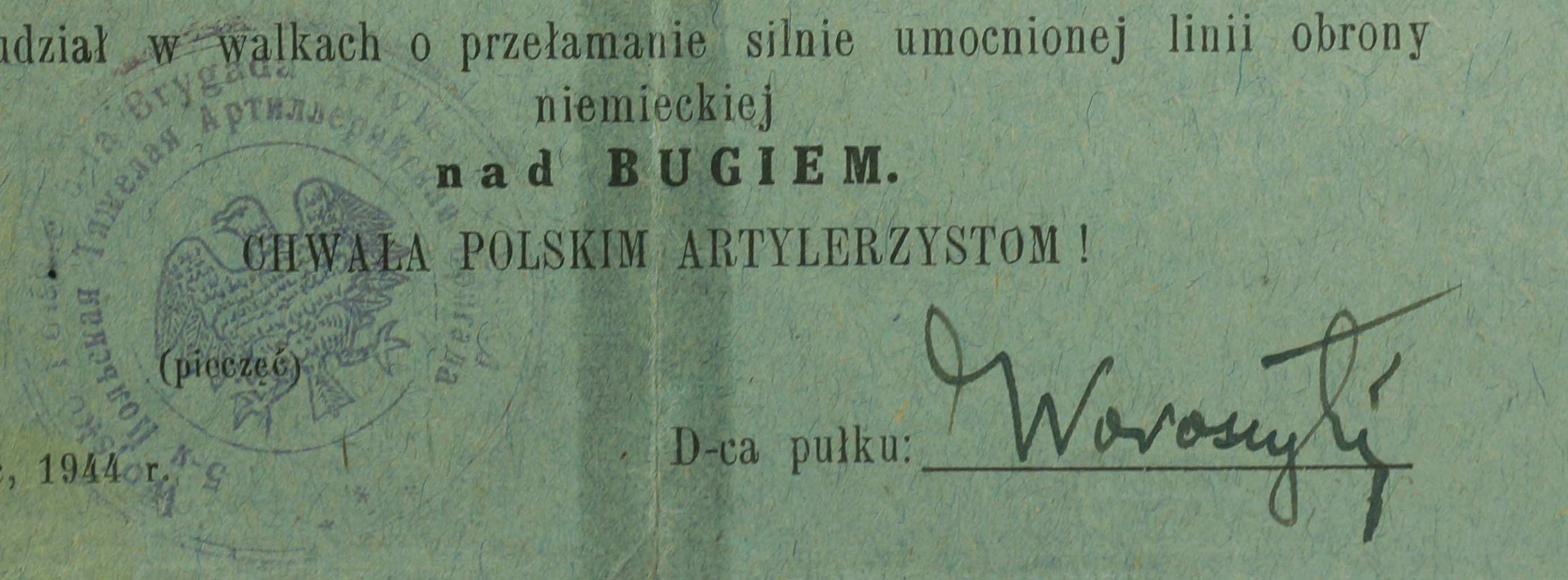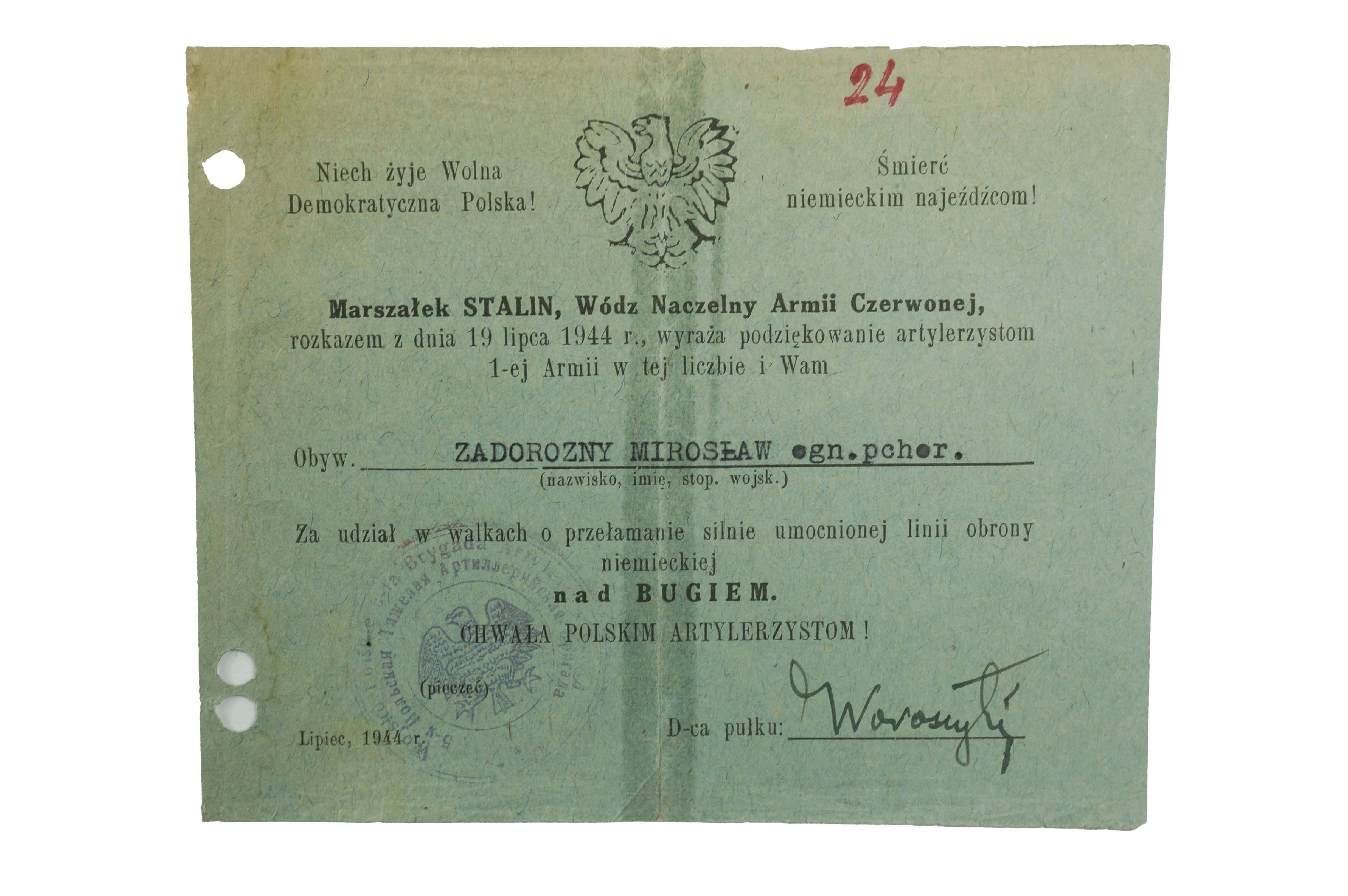 Naczelny Wódz Armii Czerwonej, Marszałek Stalin rozkazem z dnia 19 lipca 1944r. wyraża podziękowanie artylerzystom 1-ej Armii w tej liczbie i Wam Obyw. ogn. pchor.. Zadorożny Mirosław za udział w walkacho przełamanie silnie umocnionej lini obrony niemieckiej nad Bugiem. Chwała polskim artylerzystom, f. 15,5x10,7cm, RZADKIE