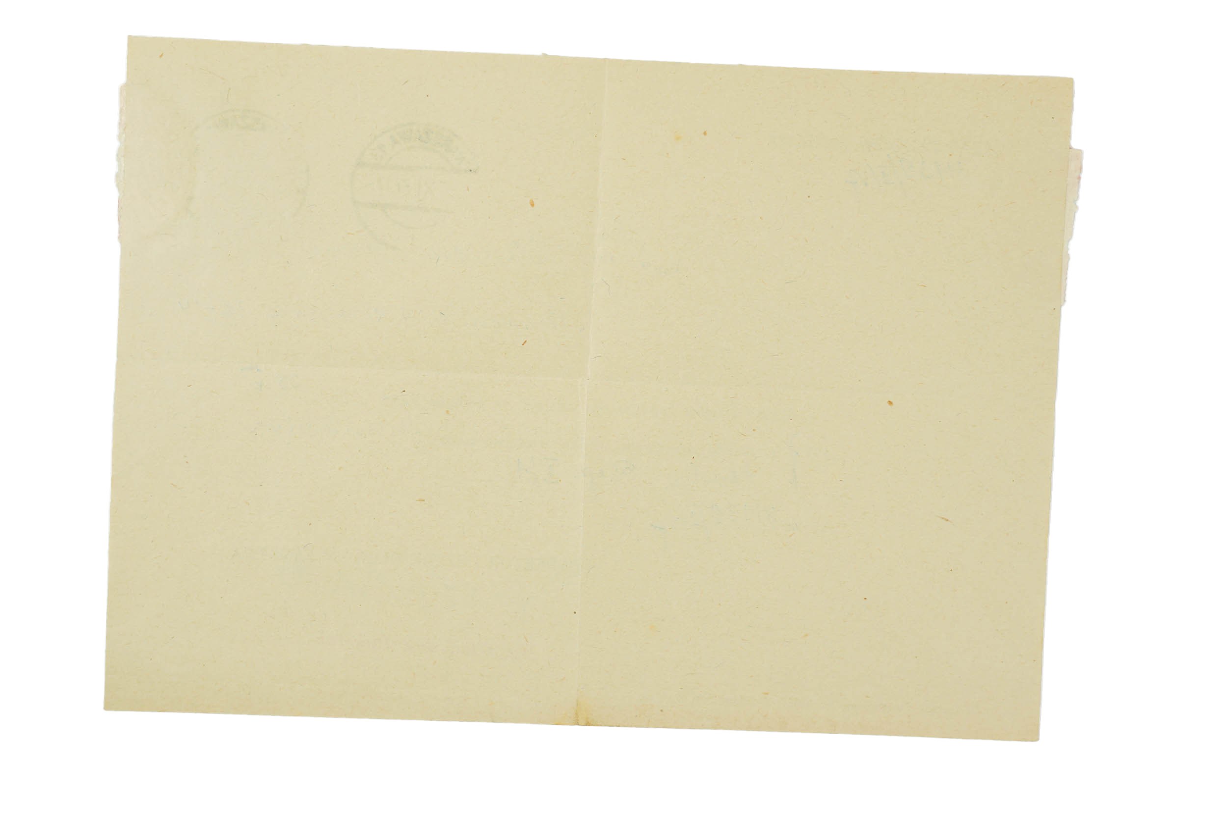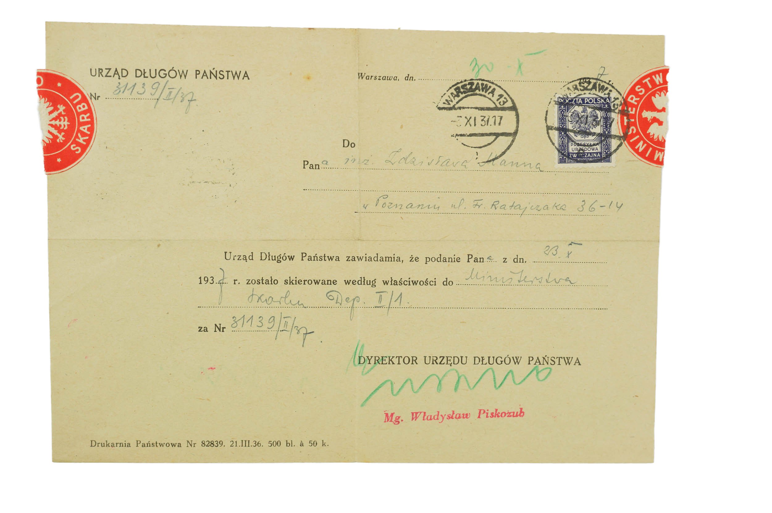 Urząd Długów Państwa , korespondencja z 3.XI.1937r. o przekazaniu podania do właściwej jednostki Ministerstwa Skarbu, zalepka Ministerstwa Skarbu, znaczek i stemple obiegu pocztowego, f. 20,5x15cm, [1]
