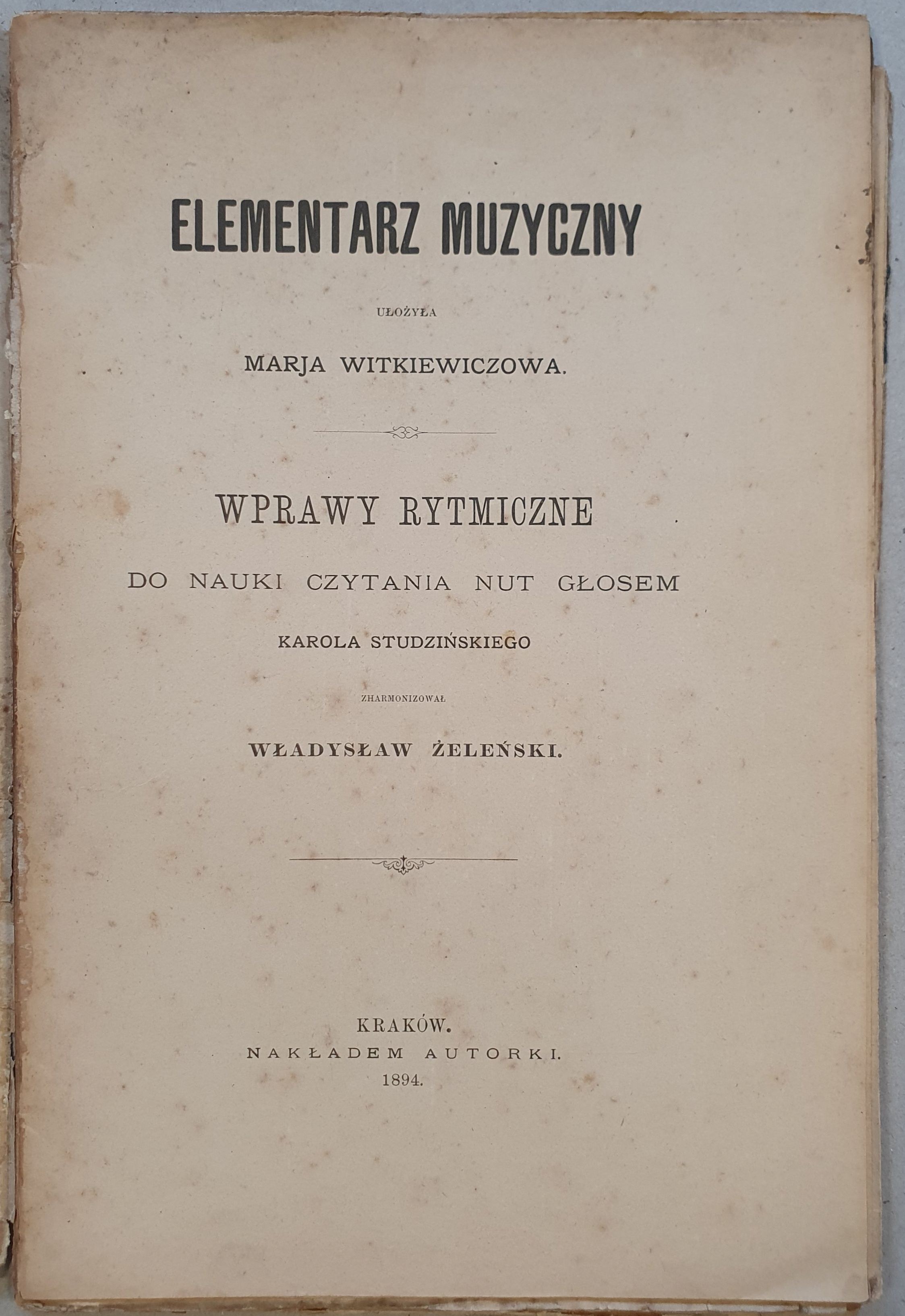 Witkiewiczowa Maria - Elementarz muzyczny ułożyła Marja Witkiewiczowa. Wyprawy rytmiczne do nauki czytania nut głosem Karola Studzińskiego sharmonizował Władysław Żeleński. Kraków: Nakładem autorki, skład główny S.A. Krzyżanowski, 1894. Druk Wł. Anczyca i Spółki pod zarządem Jana Gadowskiego.