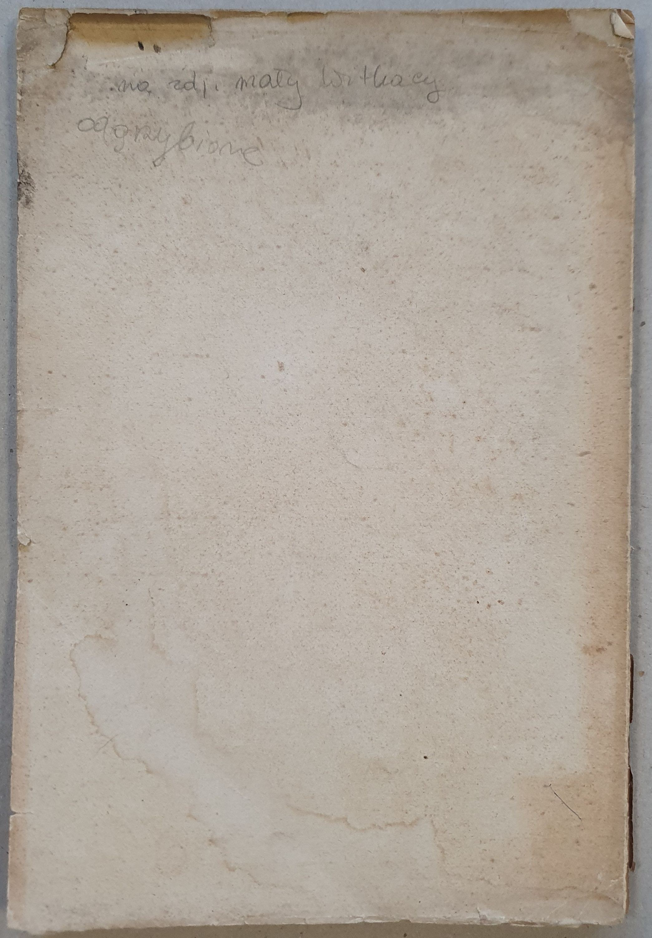 Stan: grzbiet pęknięty na całej długości, wykruszony, blok książki pęknięty w dwóch miejscach - po s.16 i 64, nici poluzowane i spękane. Przednia okładka z żółtawymi przebarwieniami i plamkami, pęknięta po prawej stronie, kilka pierwszych kart z przebarwieniami, s.5 ze śladem zalania u dołu, s.65 zabrudzona. Tylna okładka z przebarwieniami i śladami zawilgocenia.