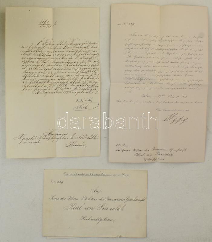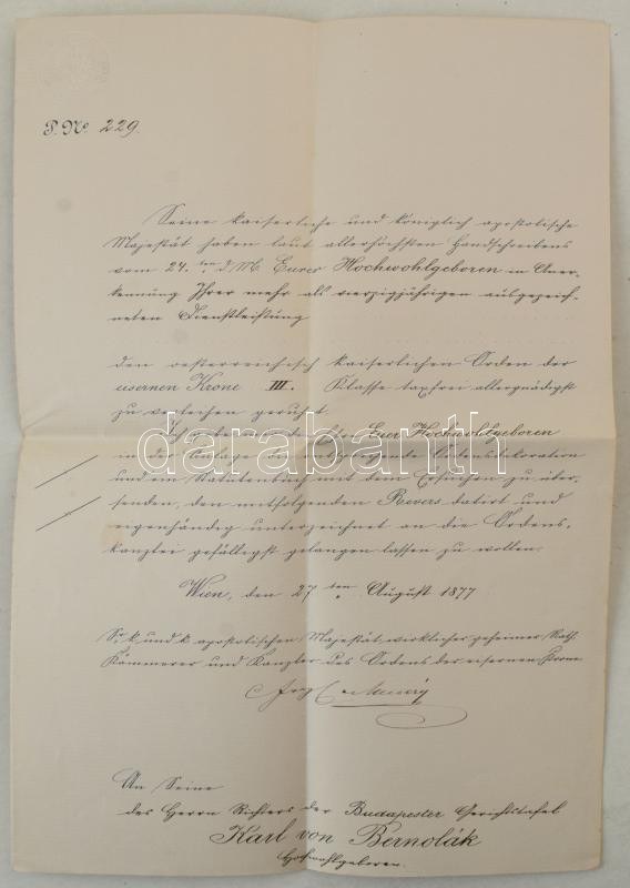 Osztrák-Magyar Monarchia 1884. "OESTERR. KAISER L. EISERNE KRON- ORDENS- DIPLOM III. CLASSE" (Vaskorona Rend III. osztálya) kitüntetésnek az iratanyag tartó mappája + 4db korabeli, szárazpecsétes levéllel + 1db borítékkal T:F, szép papírok / Austro-Hungarian Monarchy 1884. "OESTERR. KAISER L. EISERNE KRON- ORDENS- DIPLOM III. CLASSE" (Order of the Iron Crown, 3rd Class) decoration folder containing documents + 4pcs contemporary letters with dry stamps + 1pc envelope C:F, fine papers