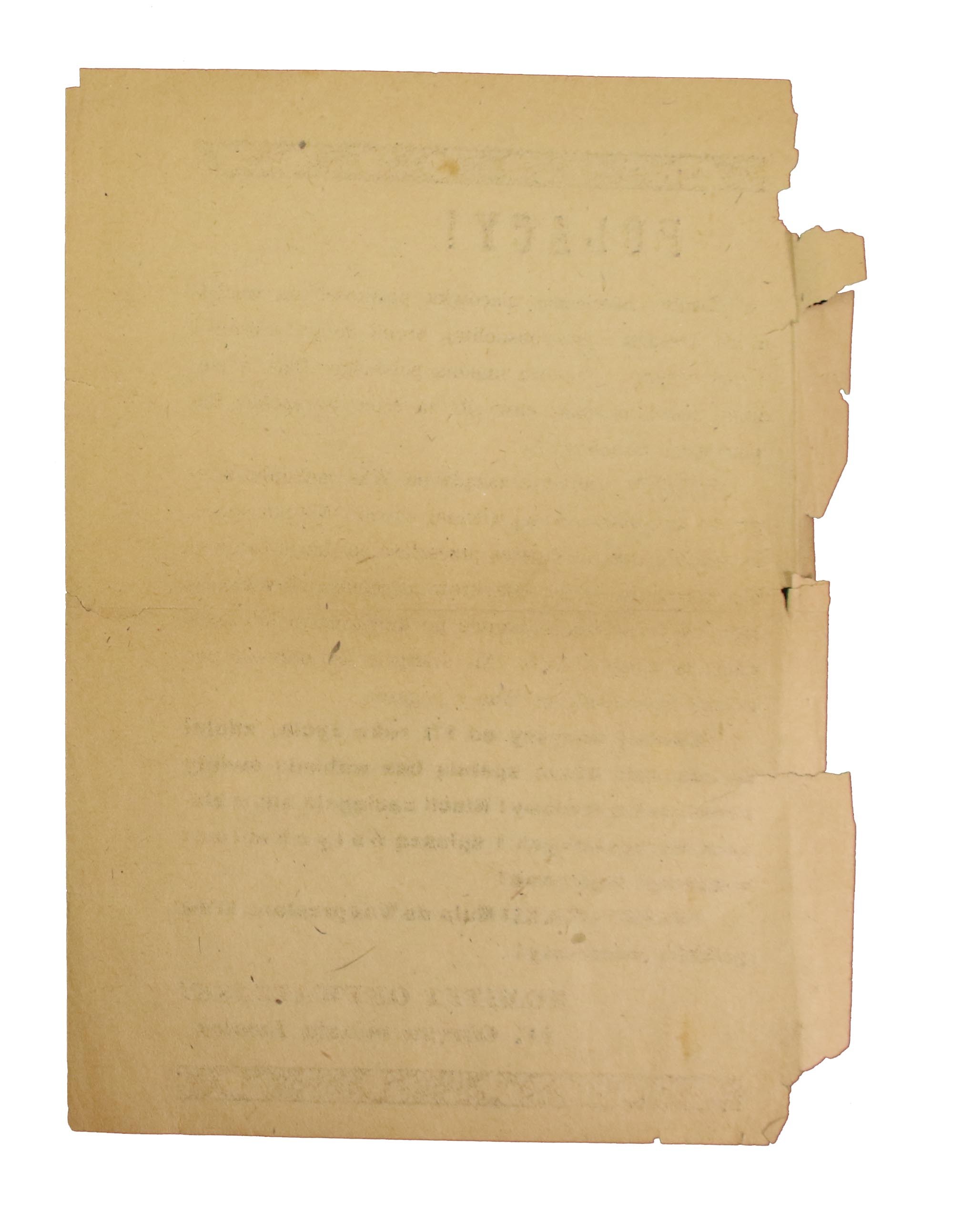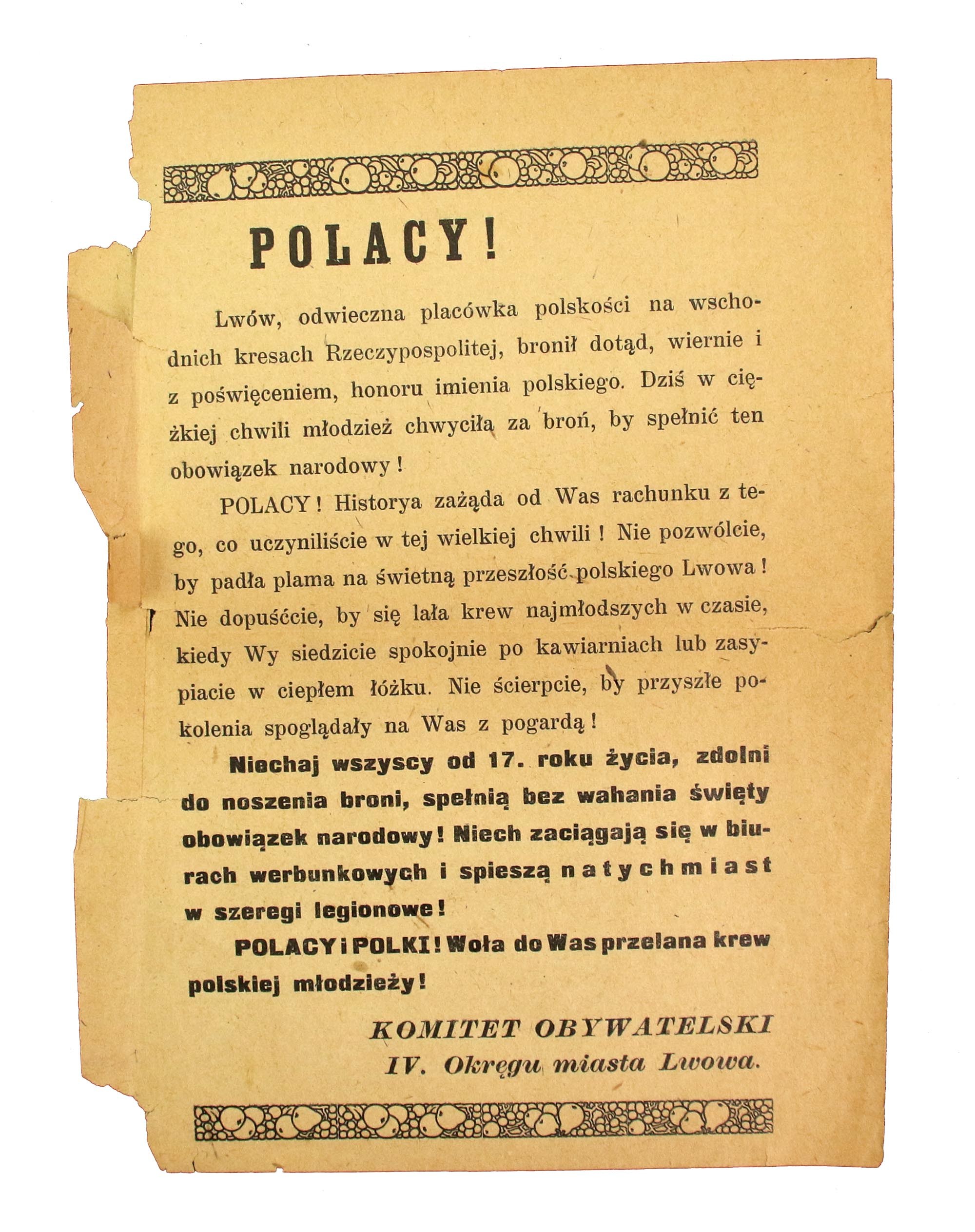 Polacy! Ulotka z okresu I wojny światowej wydana we Lwowie przez Komitet Obywatelski, wzywająca do wstępowania w szeregi Legionów Polskich. Wym. 15 x 20 cm. Ubytki lewego marginesu