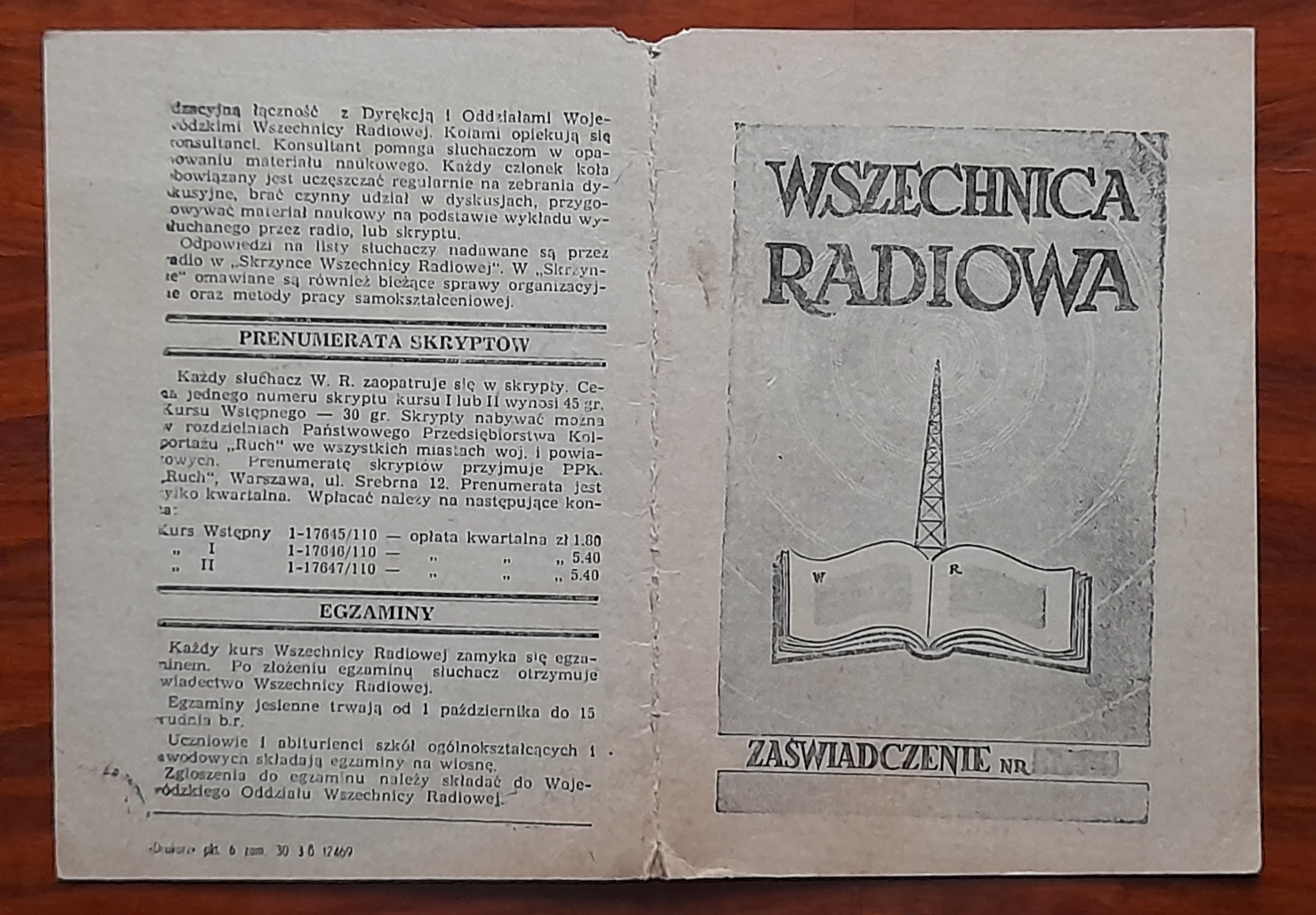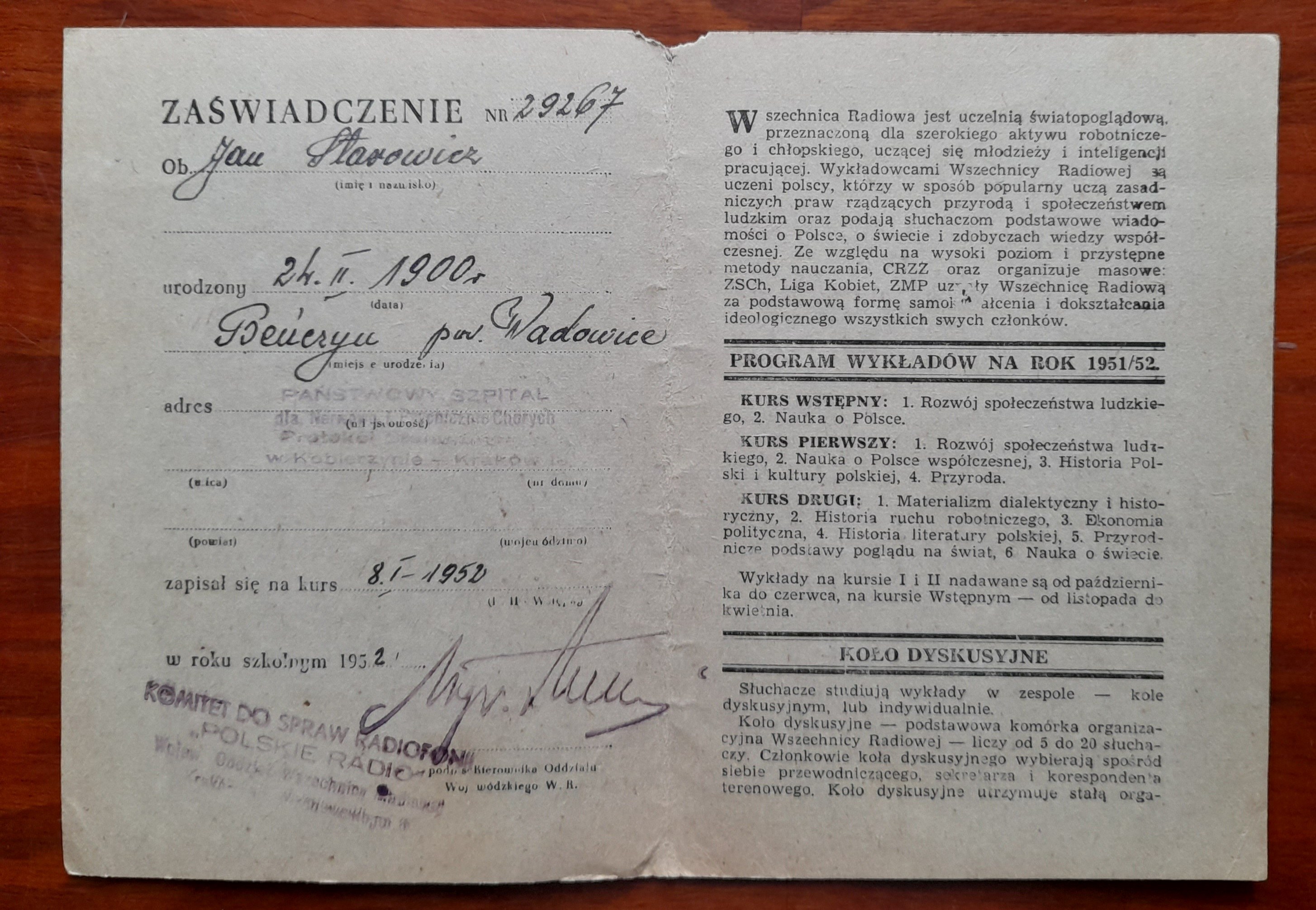 Wszechnica Radiowa.Zaświadczenie wydane na nazwisko Jan Starowicz 8.01.1952 r.
