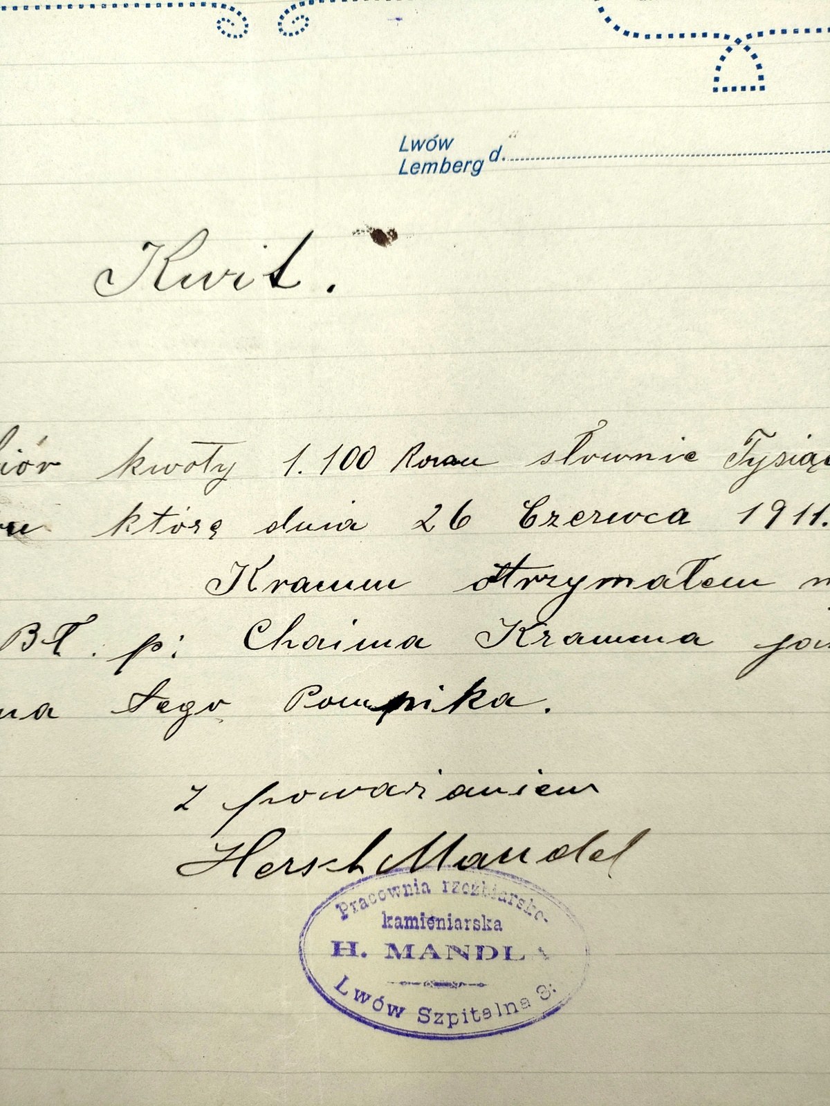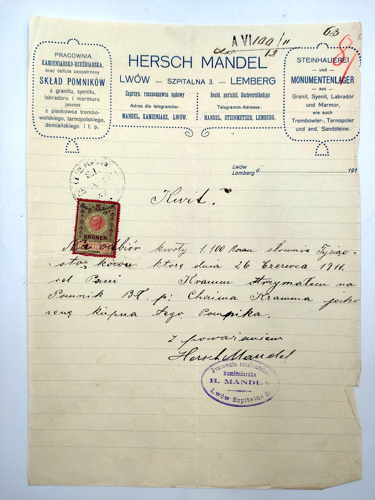 Kwit na odbiór zapłaty za pomnik - Lwów ul Szpitalna - 26 czerwca 1911