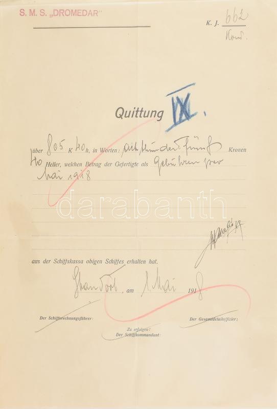 S.M.S. Dromedar az osztrák-magyar haditengerészet vontatóhajójátak tisztjei által aláírt nyugta hajópecséttel / S.M.S. Dromedar tugboat oatfficial receipt for 805.40 crowns dated May 1, 1918, and signed by commanding officer and two other officers. Rare document from a small ship late in the war.