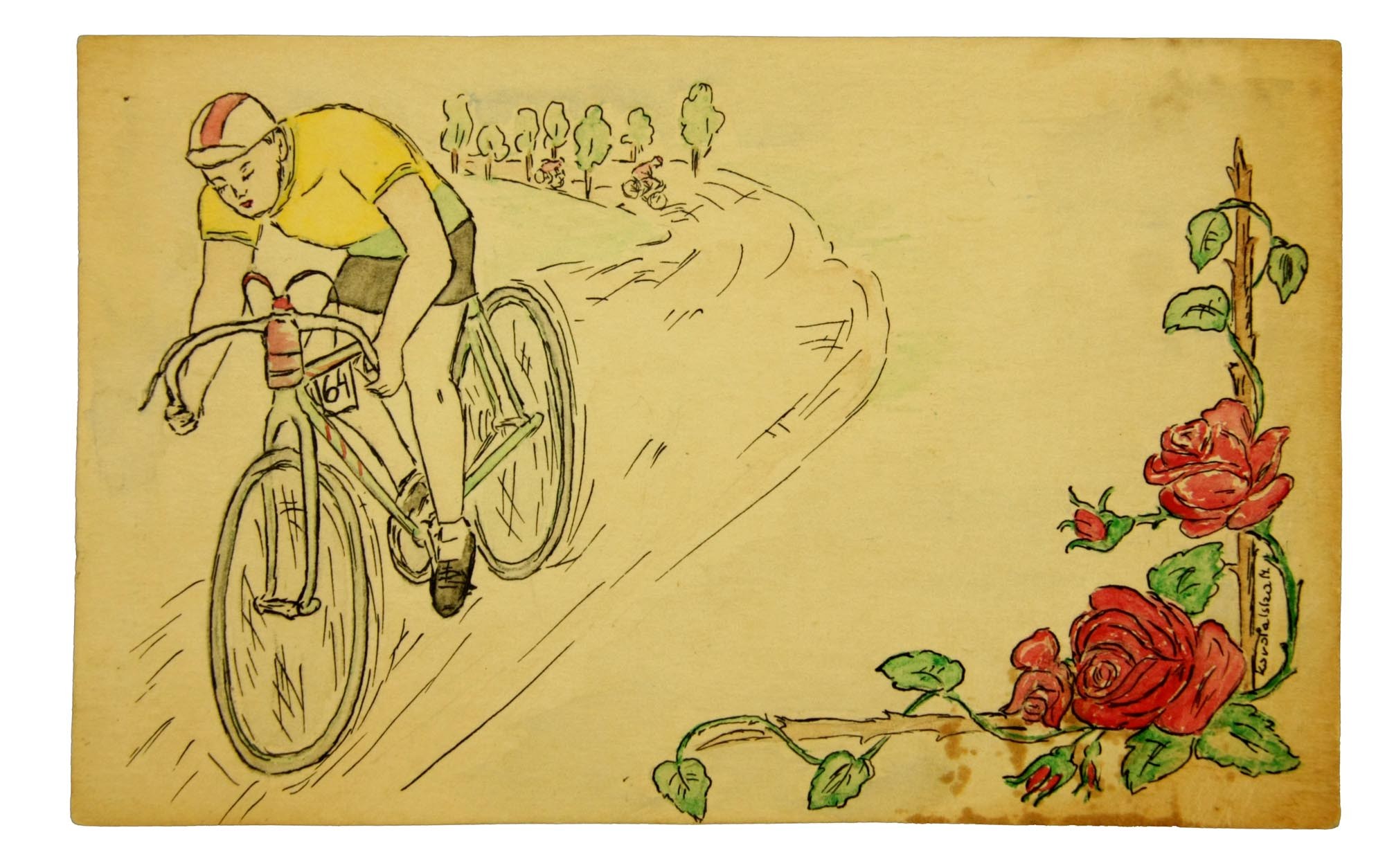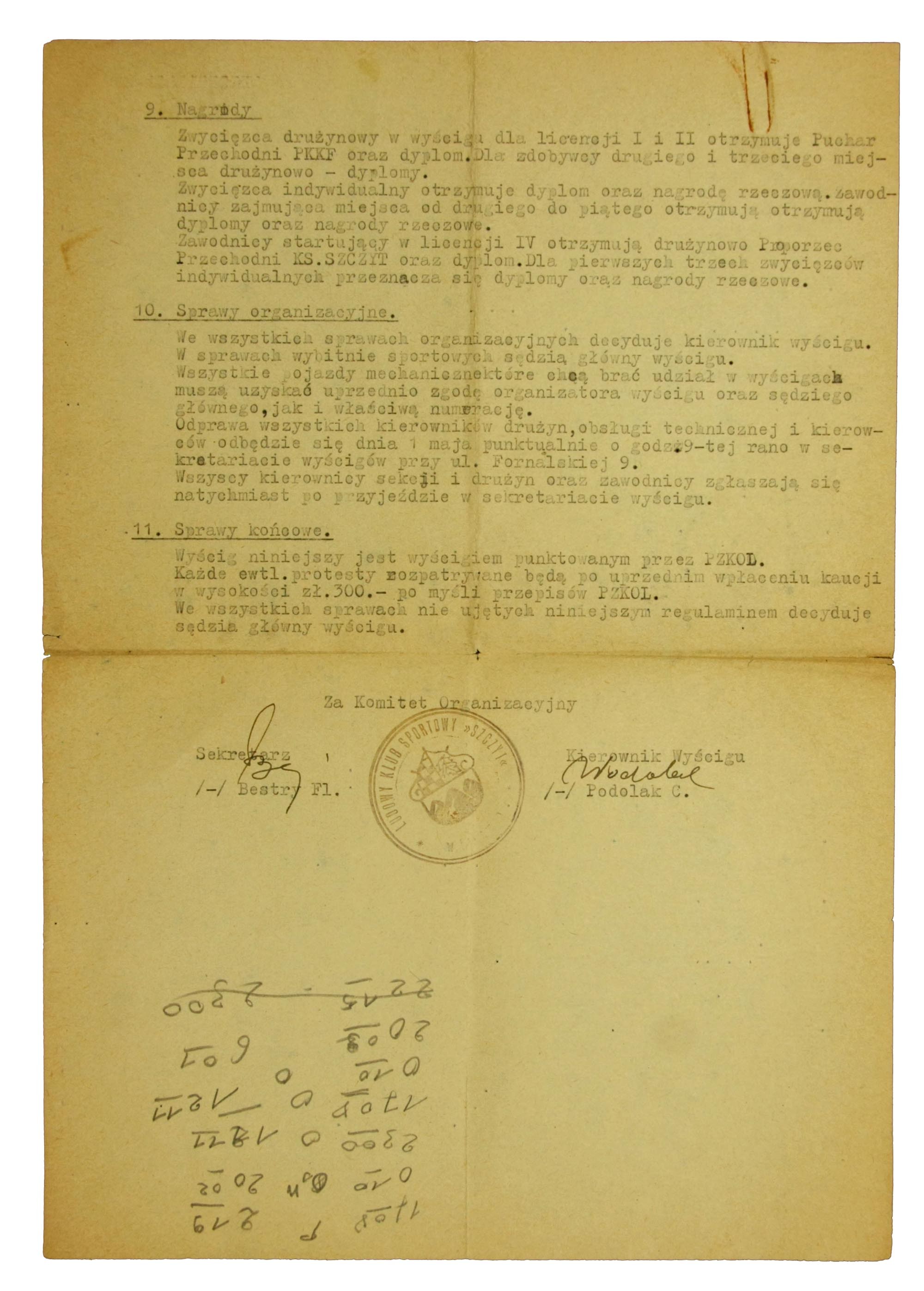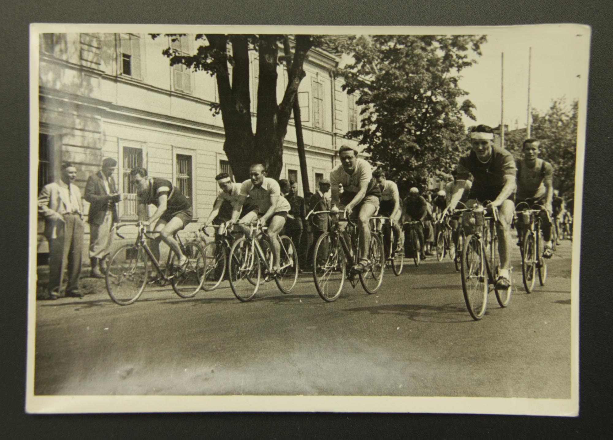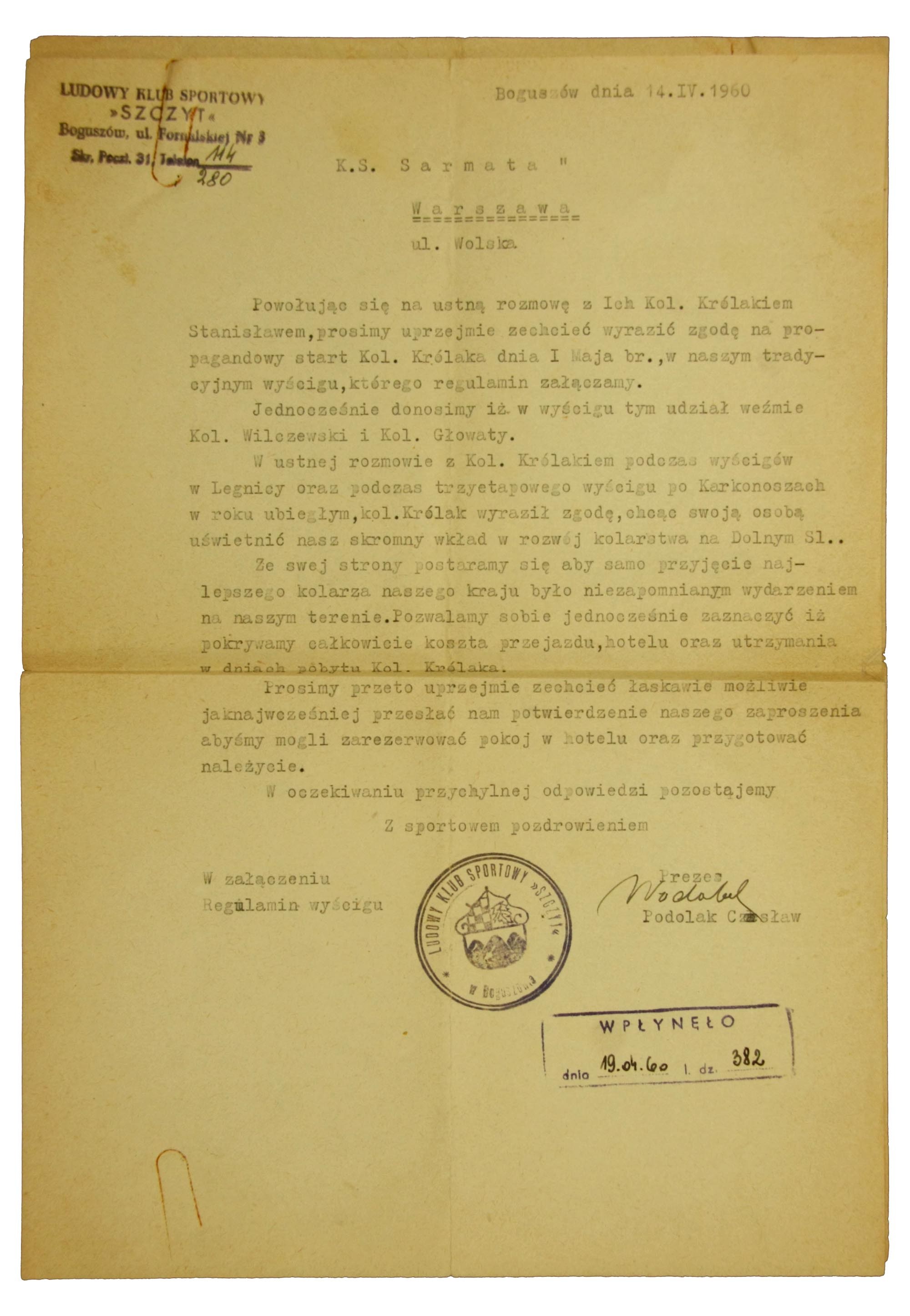 Zestaw pamiątek po kolarzu Stanisławie Królaku. W skład zestawu wchodzą: 1. pismo z 1960 r Ludowego Klubu Sportowego Szczyt w sprawie S.Królaka, 2. regulamin wyścigu kolarskiego, organizowanego przez LKS Szczyt, 3. list do redakcji Nowej Wsi z 1953r z Rudy chwalący wyczyny S.Królaka. Razem z listem pismo przewodnie i koperta z nadrukiem Nowa Wieś, 4. dwie odręcznie kolorowane laurki, 5. cztery zaproszenia dla S.Królaka, 6. dwa zdjęcia z wyścigu kolarskiego, 17 x 12 cm.