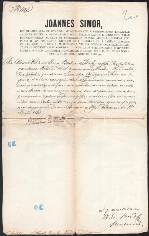1869 Simor János (1812-1891) hercegprímás, bíboros, esztergomi érsek nevében kiállított, latin nyelvű egyházi irat...