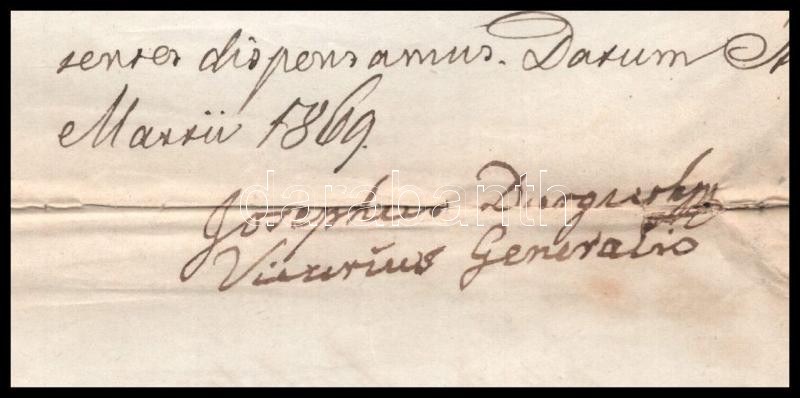1869 Simor János (1812-1891) hercegprímás, bíboros, esztergomi érsek nevében kiállított, latin nyelvű egyházi irat, Durguth József (1790-1872) esztergomi kanonok autográf aláírásával,