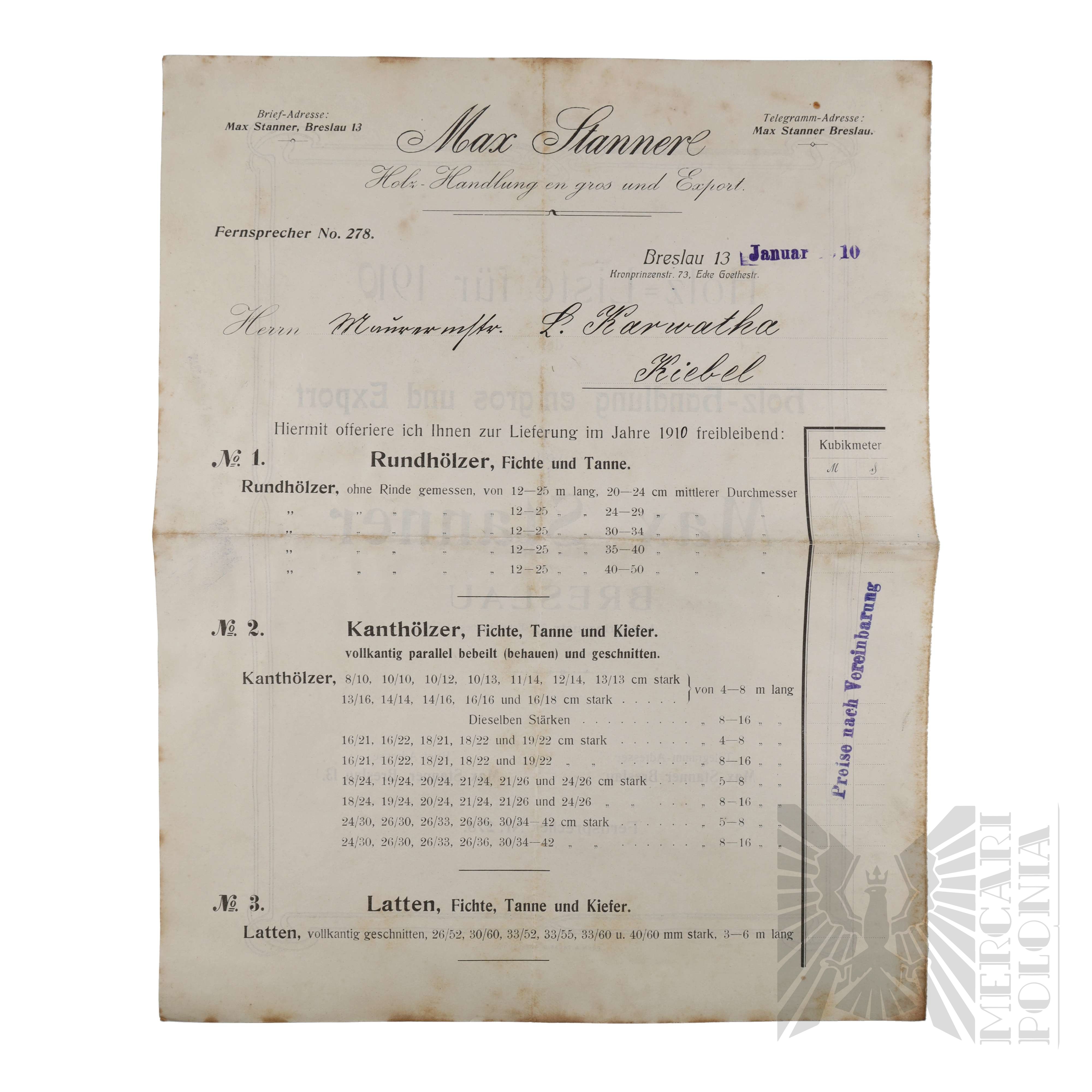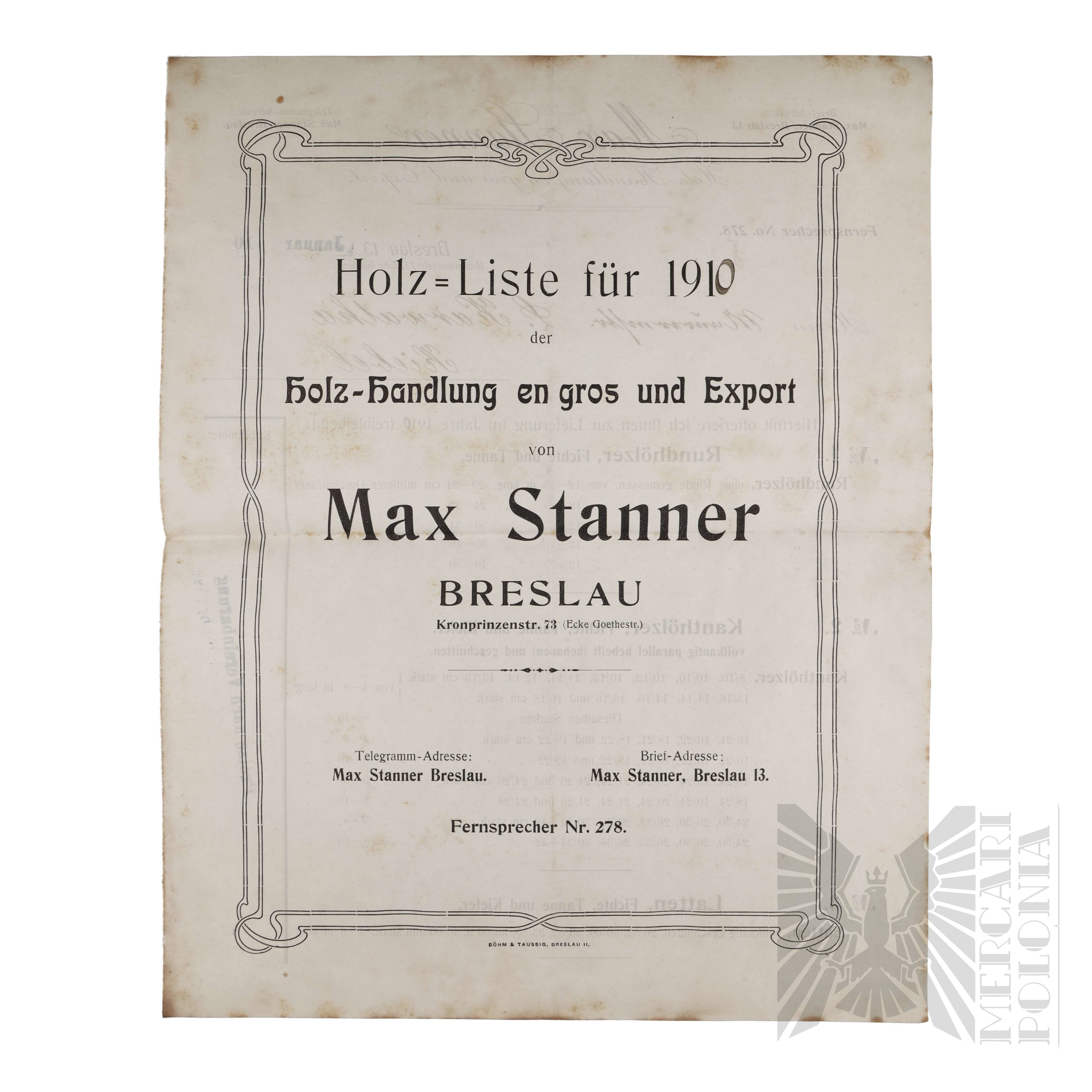 Cesarstwo Niemieckie Ulotka Reklamowa Hurtownia Drewna Max Stanner “Holz=Liste fuer 1910 der Holz-Handlung en gros und Export von Max Stanner” Wrocław (Breslau) 1910
