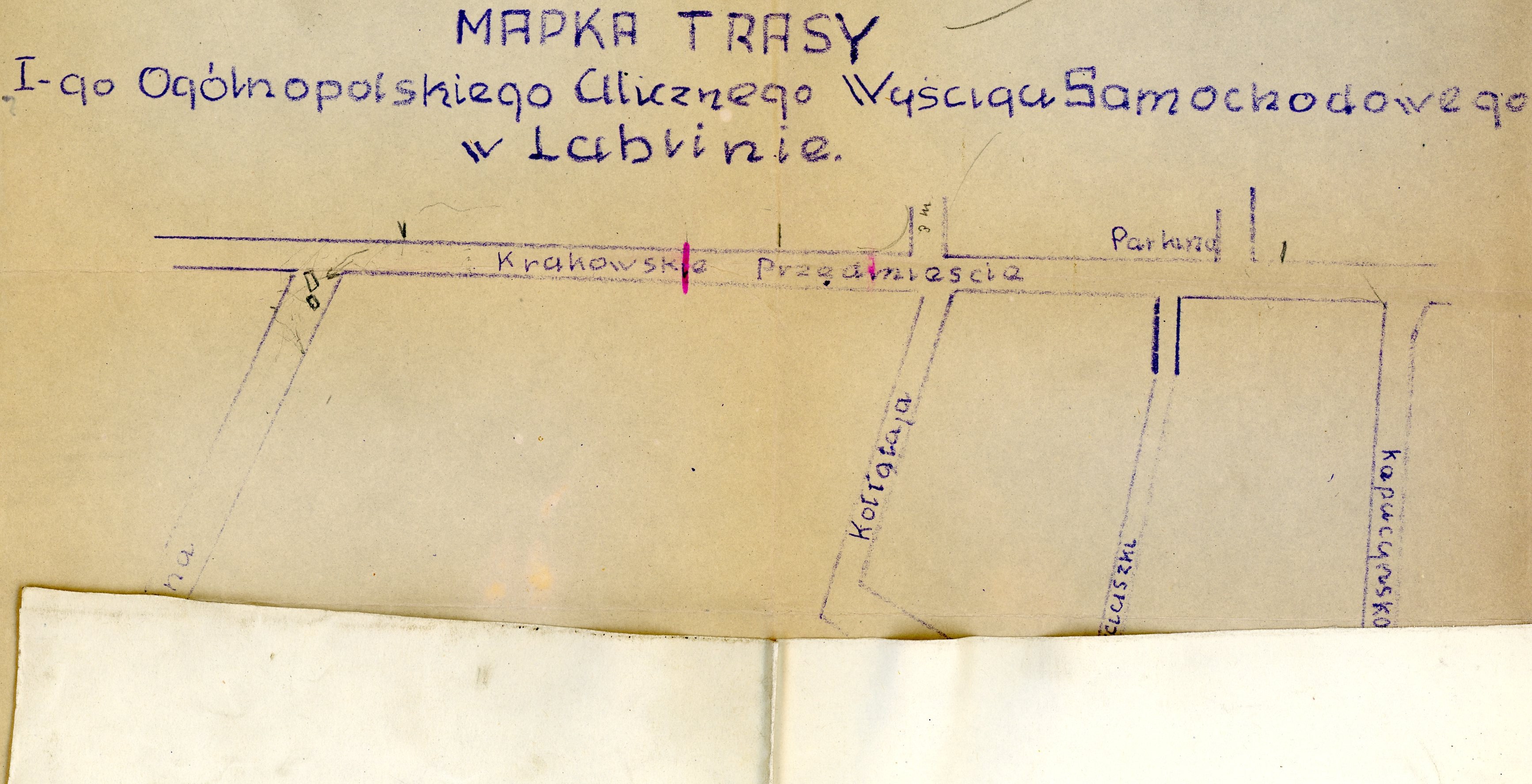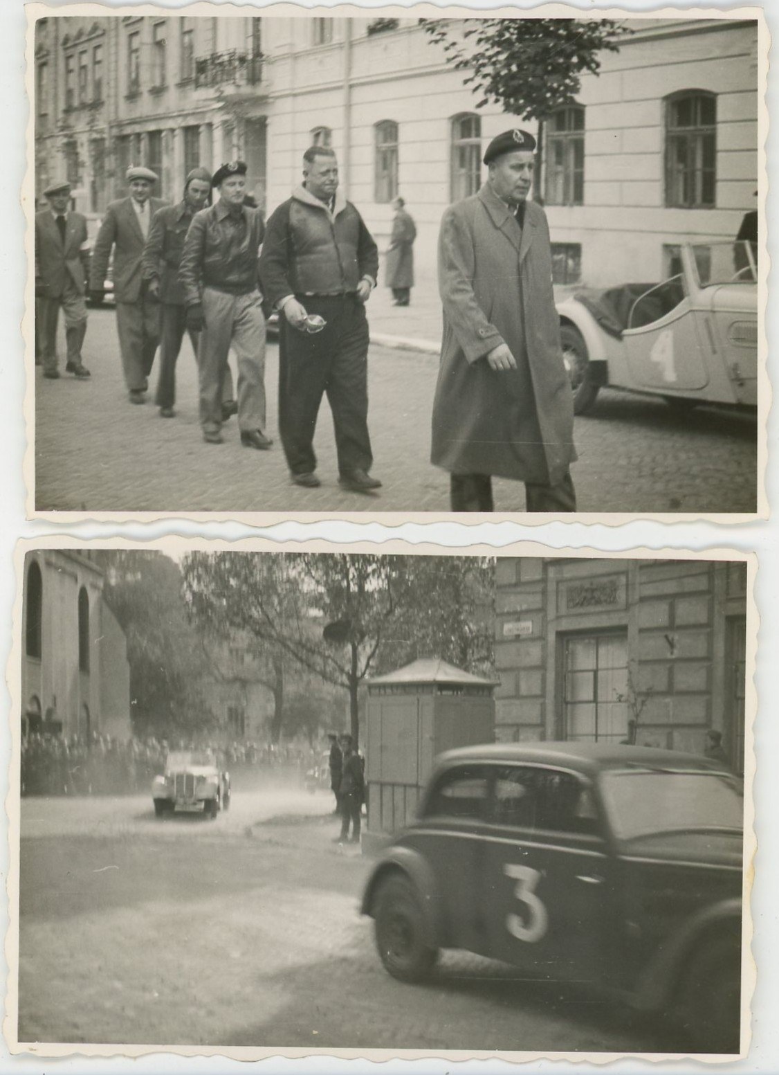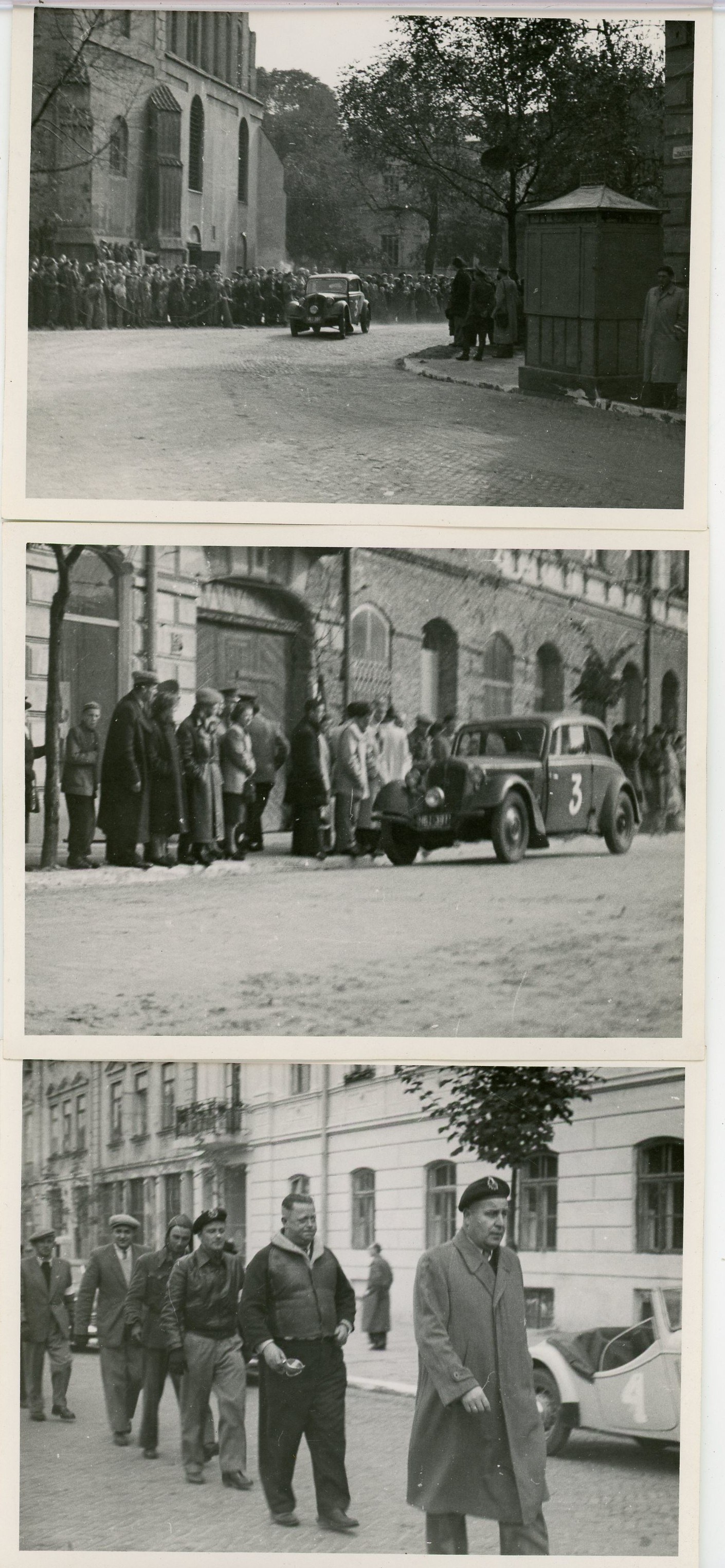 Wym,: 115 x 88 mm (6 fot.); 90 x 65 mm (2 fot.) razem 8 fot., mapka wyścigu oraz wycinek z gazety dot. wyścigu. Stan bardzo dobry.
