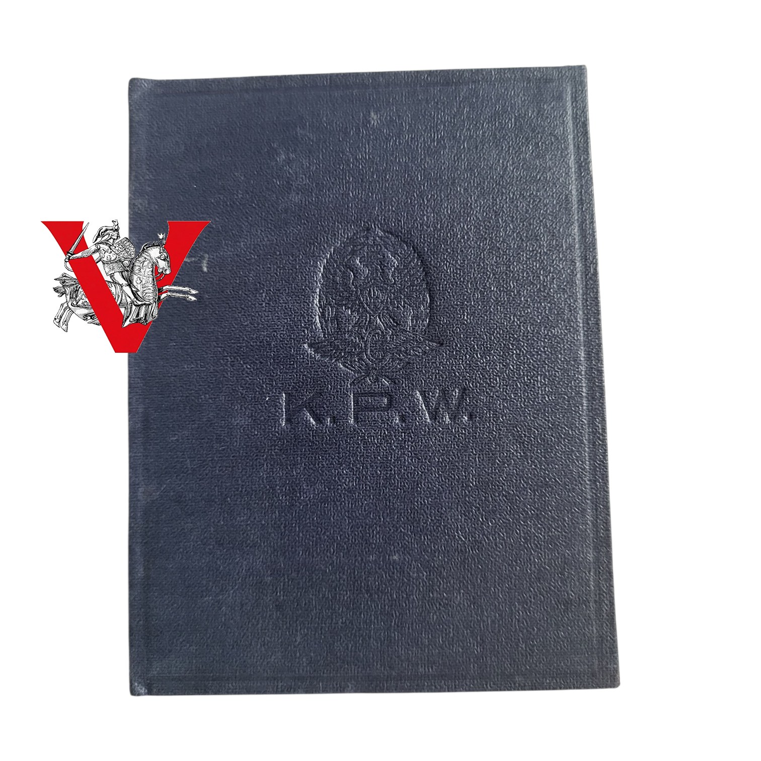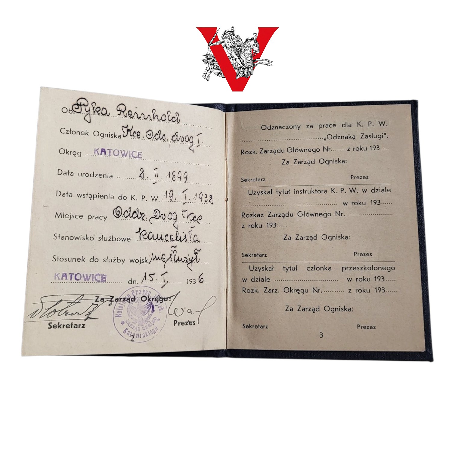 Oryginalna legitymacja członkowska Kolejowego Przysposobienia Wojskowego (K.P.W.) – Organizacji Pracowników Kolejowych Rzeczypospolitej Polskiej z 1936 roku. Dokument należał do Reinholda Pyki, kancelisty Oddziału Dróg i Taboru w Katowicach. Wydana przez Zarząd Okręgu K.P.W. w Katowicach, z oryginalnymi podpisami sekretarza i prezesa oraz czytelną pieczęcią.