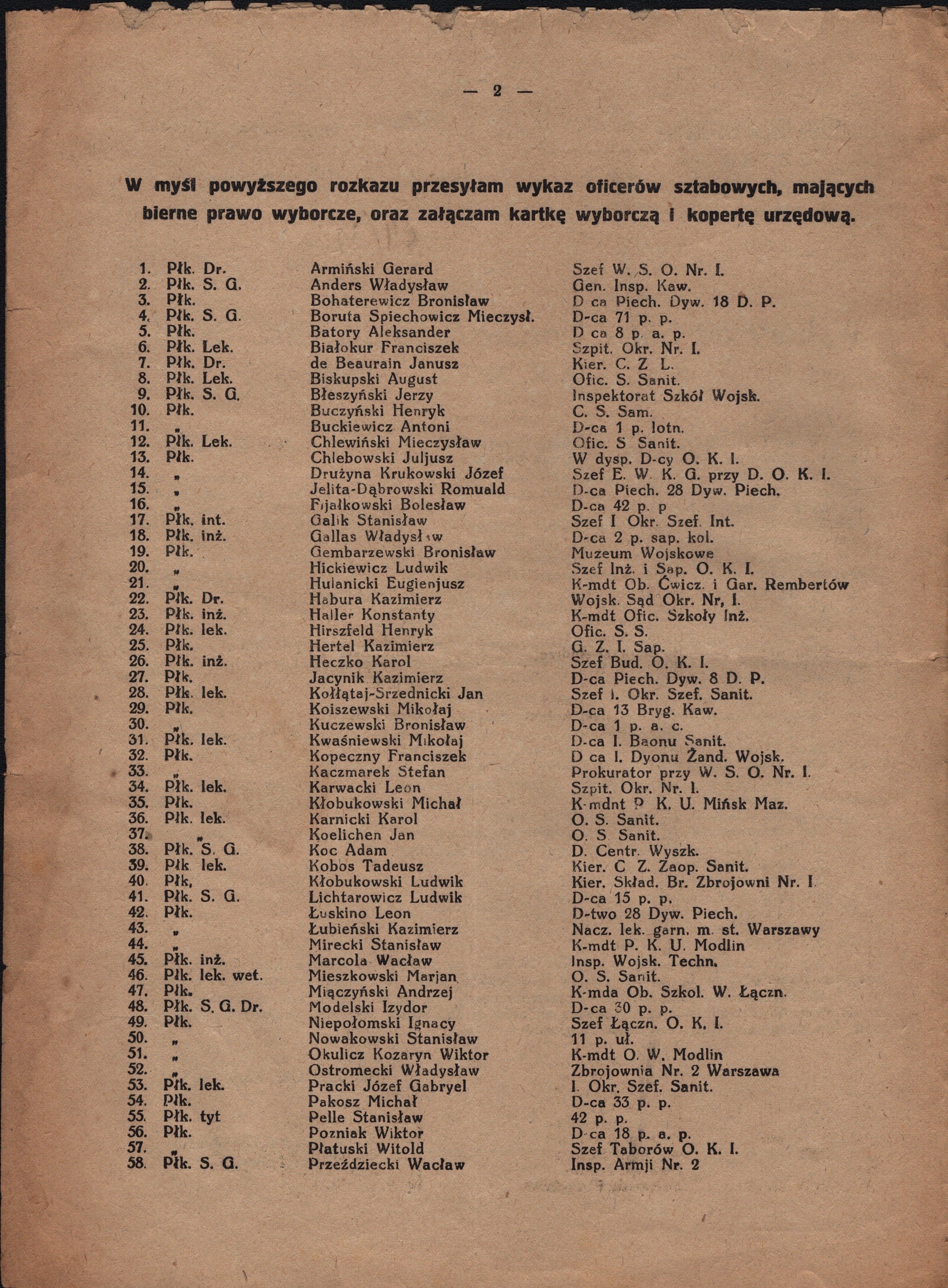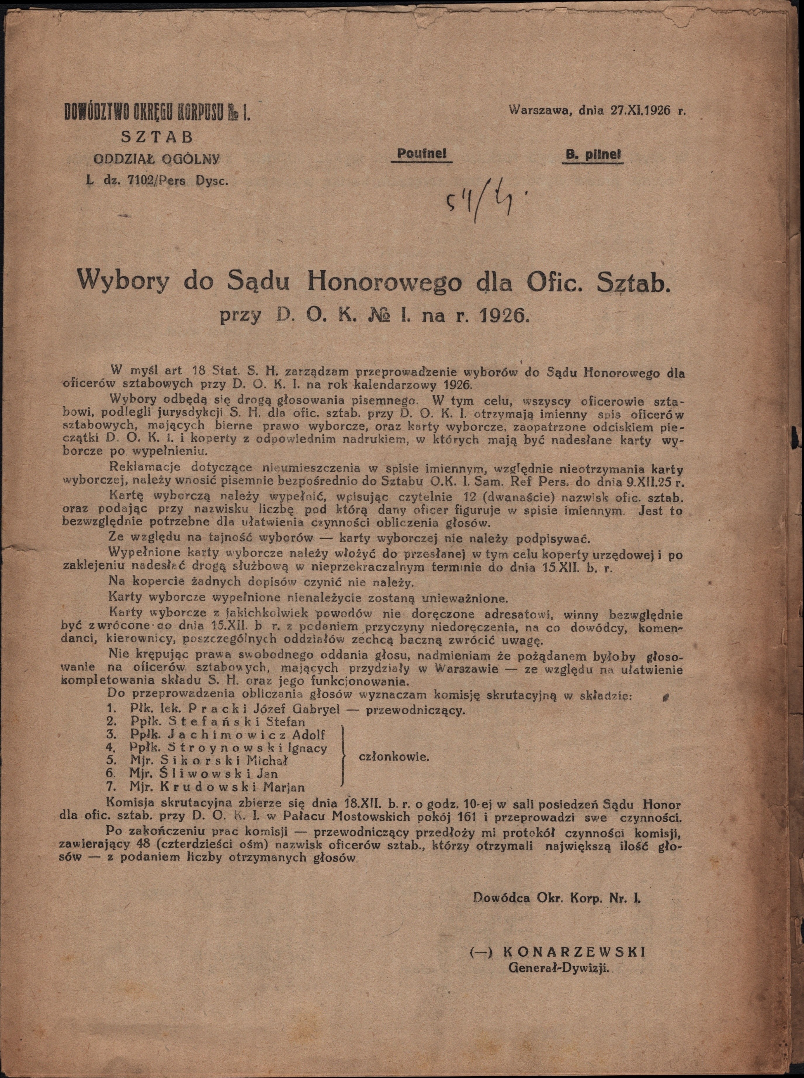 Druk poufny wystosowany 27 XI 1926 przez Sztab Oddziału Głównego Dowództwa Okręgu Korpusu Nr 1 w Warszawie w sprawie wyborów do Sądu Honorowego dla Oficerów Sztabowych przy DOK Nr 1 na rok 1926. Zawiera wykaz 542 nazwisk oficerów wraz z przydziałem służbowym.
