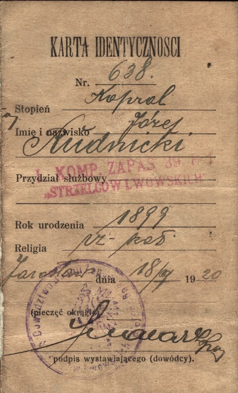 Karta identyczności wystawiona dla kapral Józefa Rudnickiego z I. Kompanii Zapasowej 39. Pułku Piechoty Strzelców Lwowskich. Dokument dat. Jarosław, 18/9 1920.