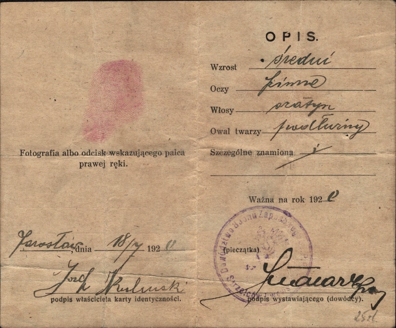 Odcisk wskazującego palca prawej ręki właściciela karty. Pieczęć pułku. Podpis niezidentyfikowanego wojskowego. Wym. po rozł.: 14,2 x 12 cm.