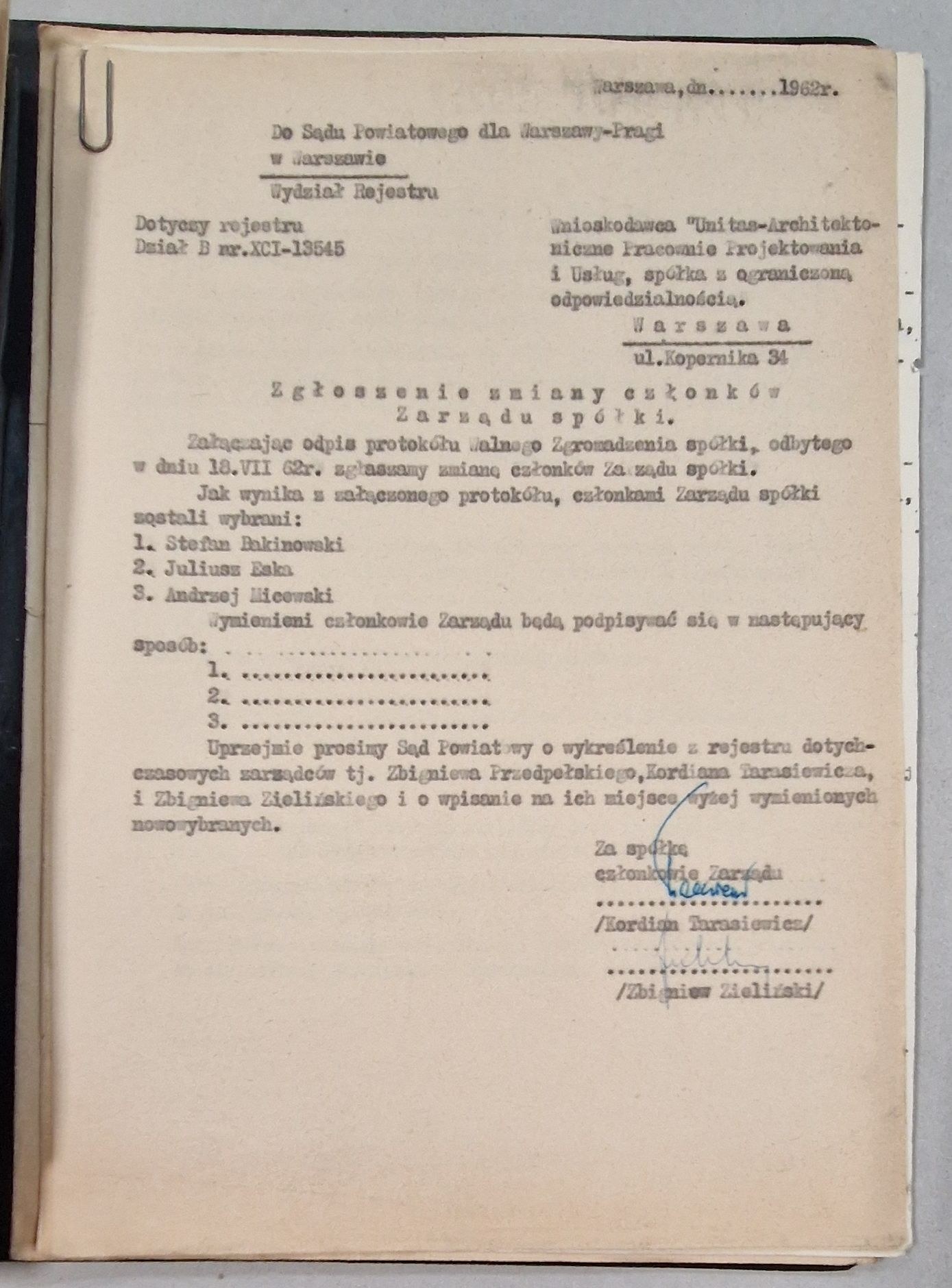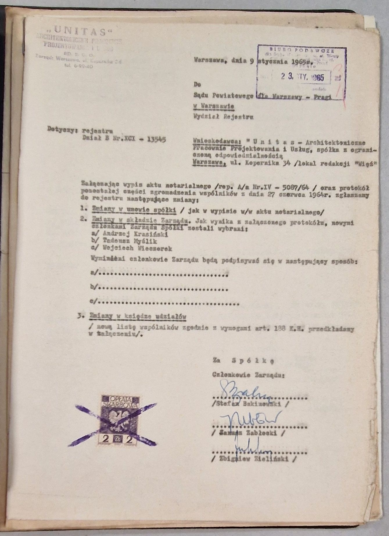 - 1 str. druk, z 9 stycznia 1965, zaadresowany „Do Sądu Powiatowego dla Warszawy-Pragi w Warszawie, ze Zgłoszeniem zmiany członków Zarządu spółki „Unitas - Architektoniczne Pracownie Projektowania i Usług, spółka z ograniczoną odpowiedzialnością”, nowymi członkami Zarządu, którymi zostali Andrzej Krasiński, Tadeusz Myślik, Wojciech Wieczorek.(bez dołączonej kopii protokołu walnego zgromadzenia).