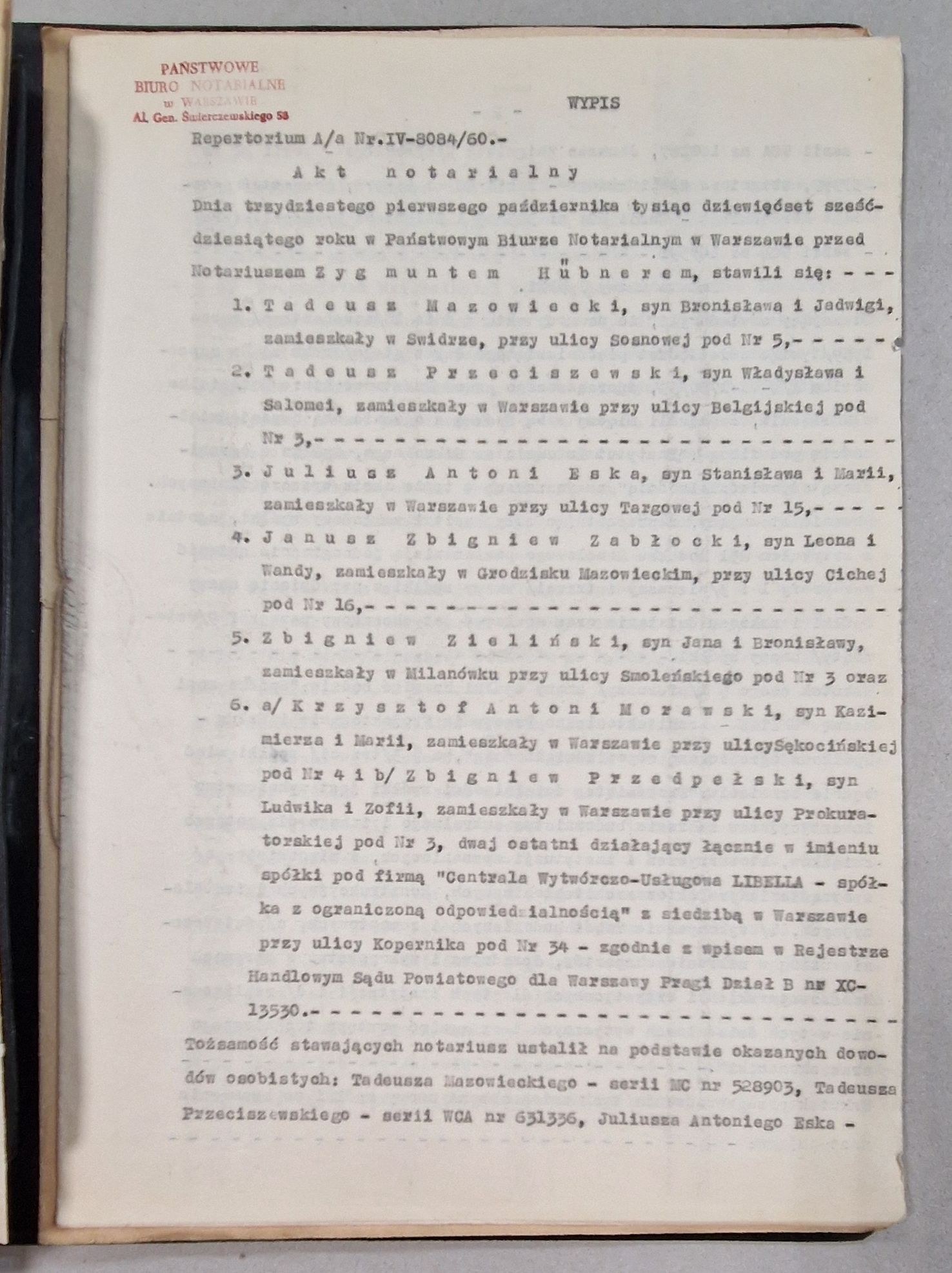 - Wypis Aktu Notarialnego, Repertorium A/a Nr. IV-8084/60.- wystawiony przez Państwowe Biuro Notarialne w Warszawie, Al. Gen. Świerczewskiego 58, kopia przez kalkę poświadczona pieczątką i odręcznym podpisem notariusza Zygmunta Hübnera z dnia 26 kwietnia 1961. 5 stron (na 4 kartach). Odpis dokumentu wystawionego w dniu 31.X.1960 roku, dotyczącego zmiany nazwy spółki z „Instytut Budownictwa Sakralnego, spółka z ograniczoną odpowiedzialnością” na „UNITAS - Archtektoniczne Pracownie Projektowania i Usług - Spółka z ograniczoną odpowiedzialnością).