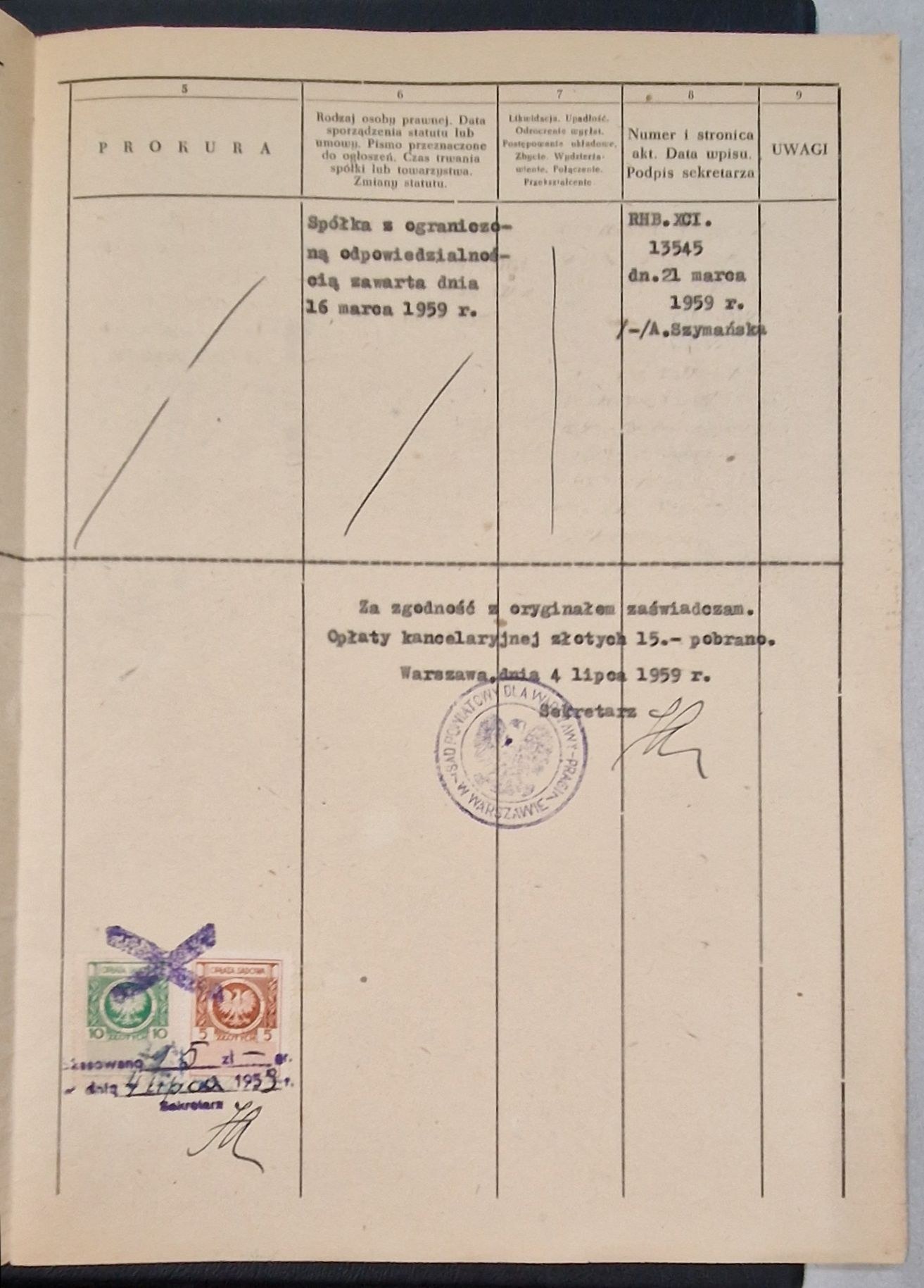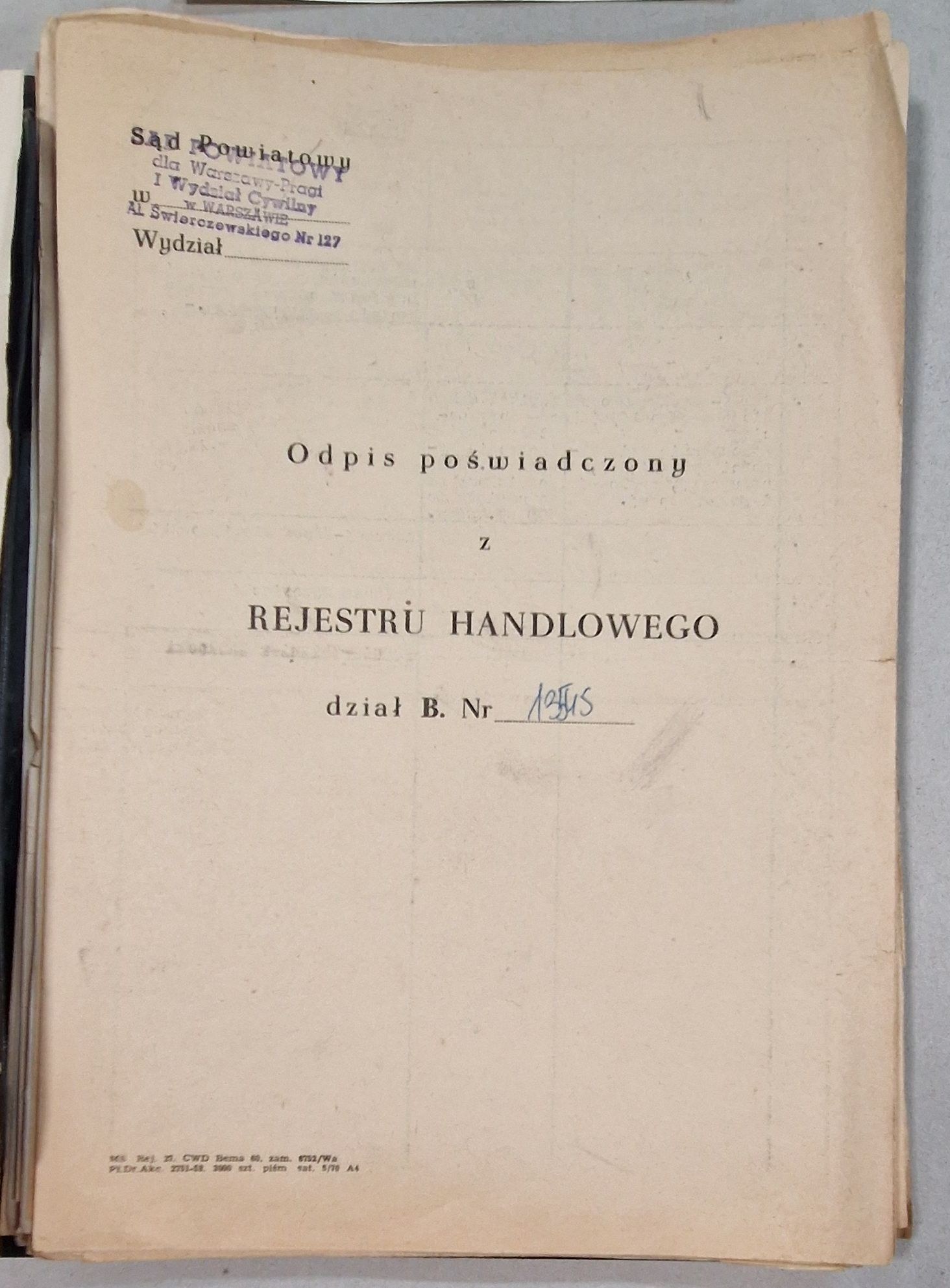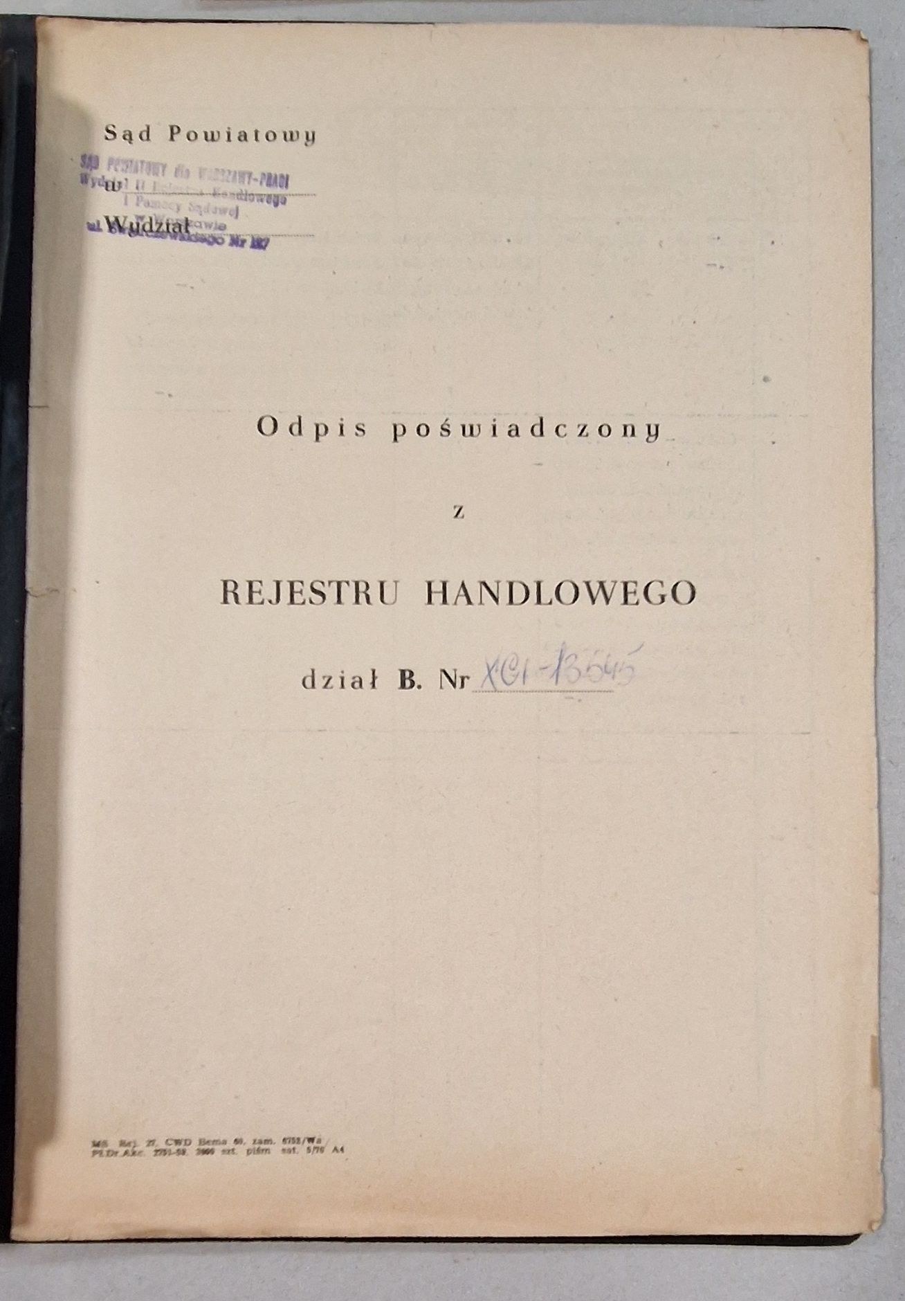 - 2x3str, oryginał i kopia przez kalkę Odpisu poświadczonego z Rejestru Handlowego dział B. Nr XCI. 13545 z 24 października 1966.