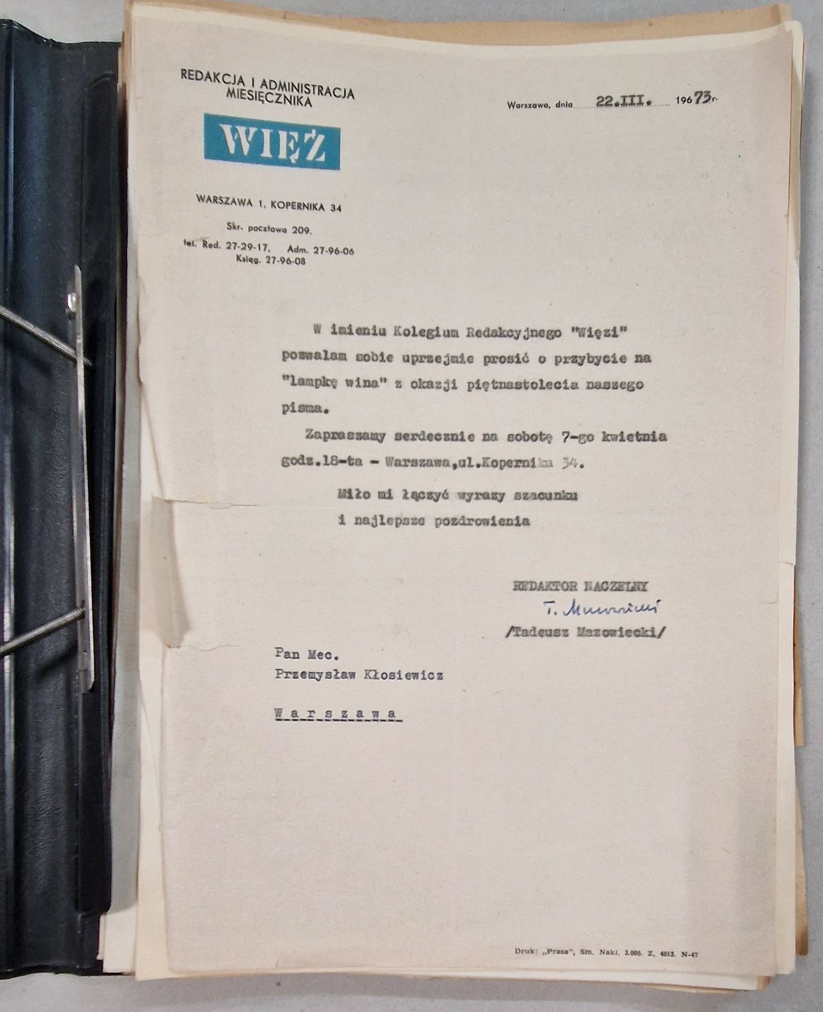 - maszynopis (kopia przez kalkę) - list na papeterii oficjalnej: Redakcja i Administracja Miesięcznika Więź, z dnia 22.III.1973 z zaproszeniem dla mecenasa Przemysława Kłosiewicza na „lampkę wina” z okazji piętnastolecia pisma. Podpis odręczny Tadeusza Mazowieckiego.