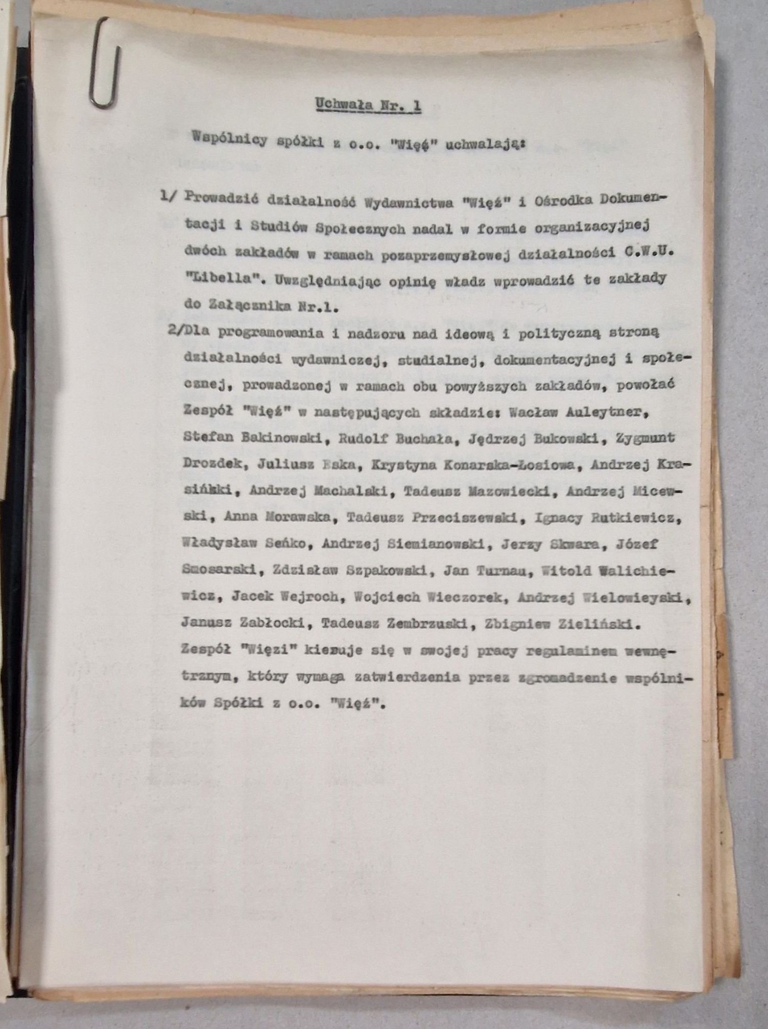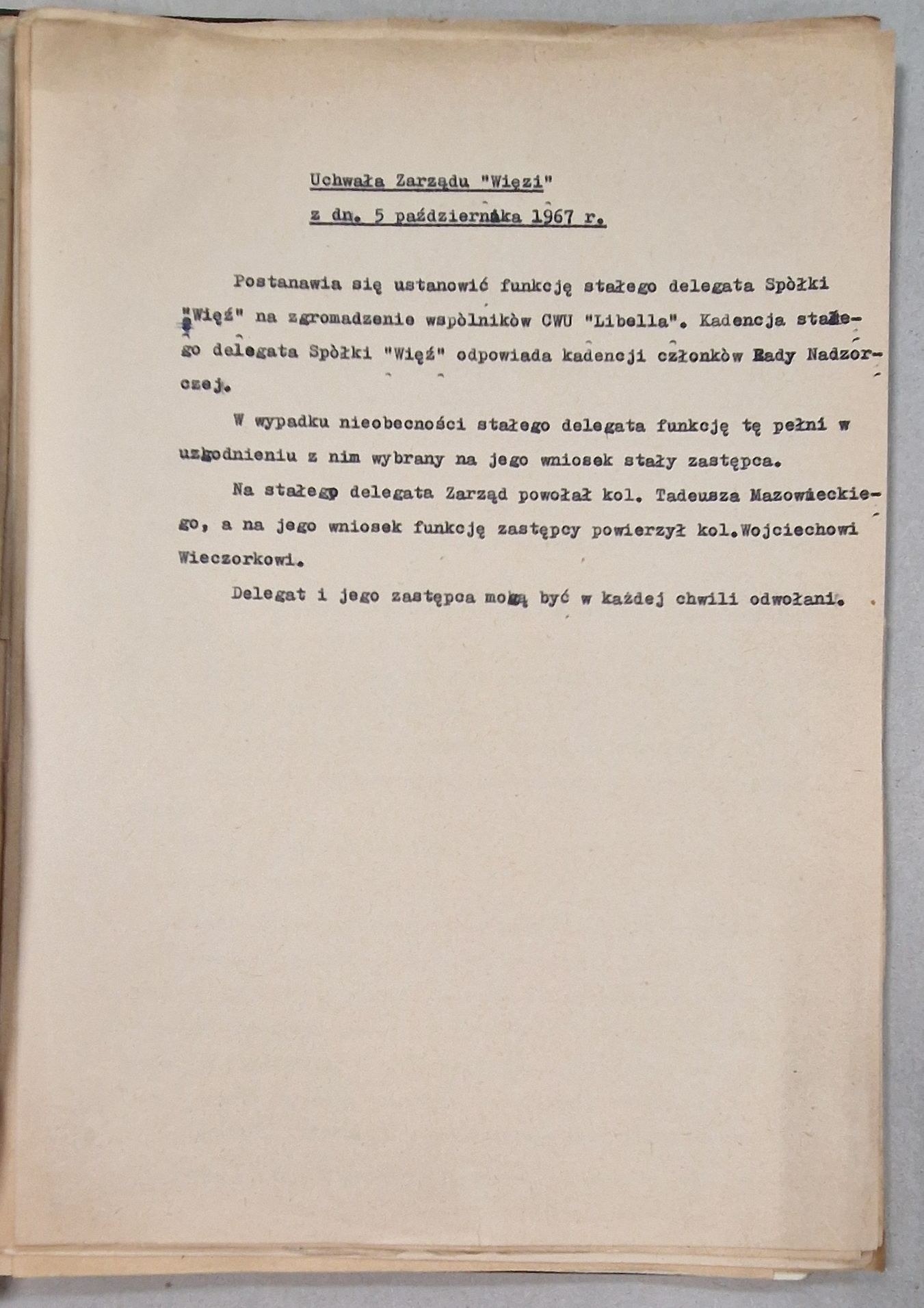 - 1 str., Uchwała Zarządu „Więzi” z dn. 5 października 1967 r., dot. ustanowienia stałego delgata Spółki „Więź” na zgromadzenia wspólników CWU „Libella” - zarząd powołał Tadeusza Mazowieckiego, a jego zastępcą został Wojciech Wieczorek.