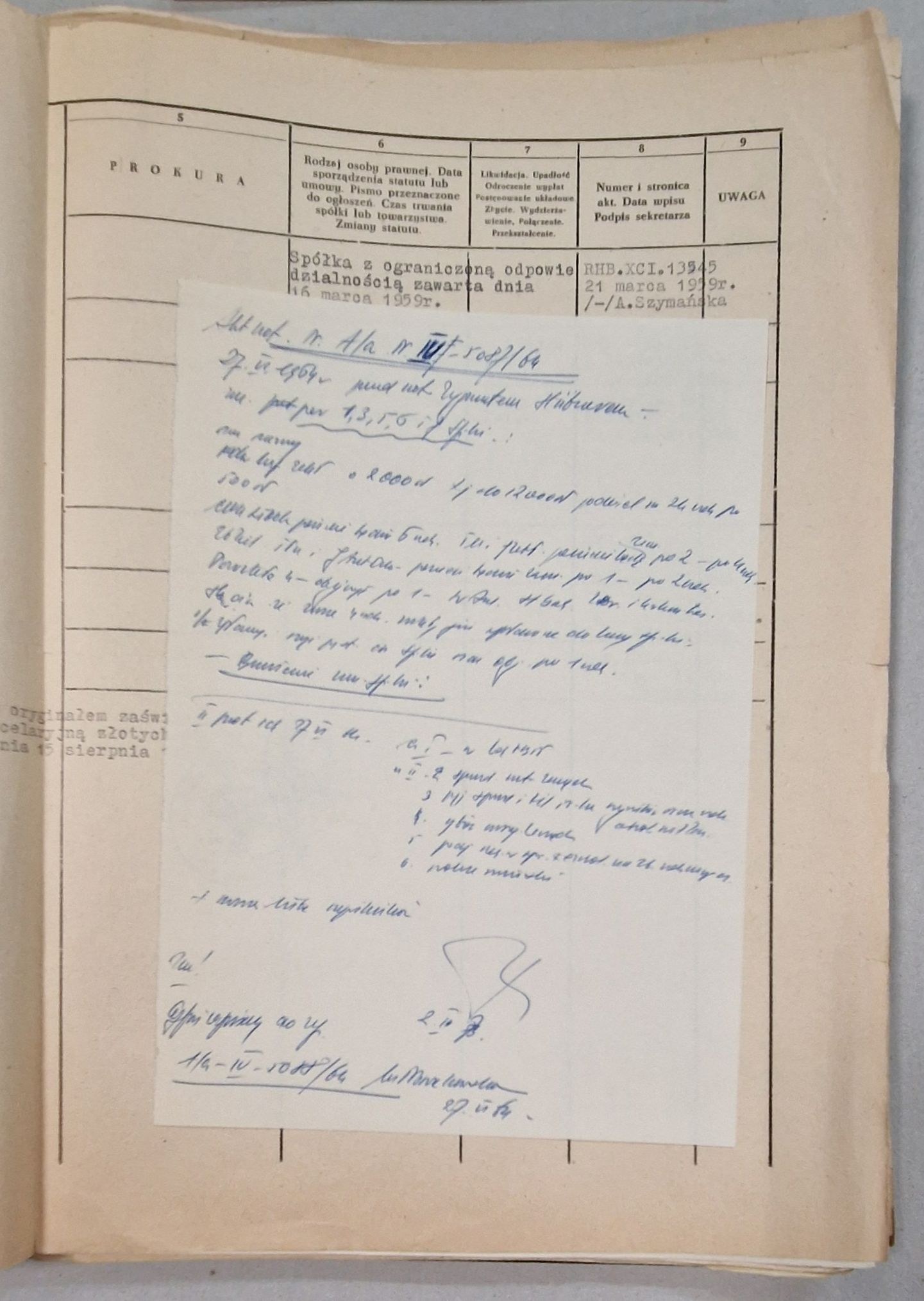 dodatkowo, w środku, kartka z notatkami odręcznymi (odnośnie zmian rejestrowych?)