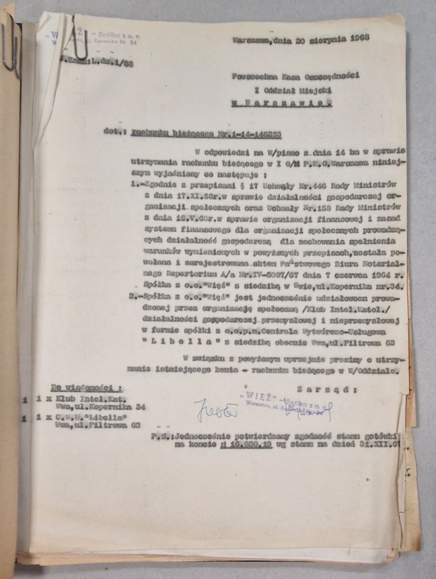 - 3 egz. (oryginał i 2 kopie maszynopisu przez kalkę), od „Więź” Spółka z o.o. do Powszechnej Kasy Oszczędności X Oddział Miejski w Warszawie,z dnia 20 sierpnia 1968, w sprawie utrzymania aktualnego rachunku bankowego (kopie korespondencji do Klubu Inteligencji Katolickiego i C.W.U, Libella, w których „Więź” miała udziały). Odręczne podpisy Janusza Zabłockeigo i Wojciecha Wieczorka.