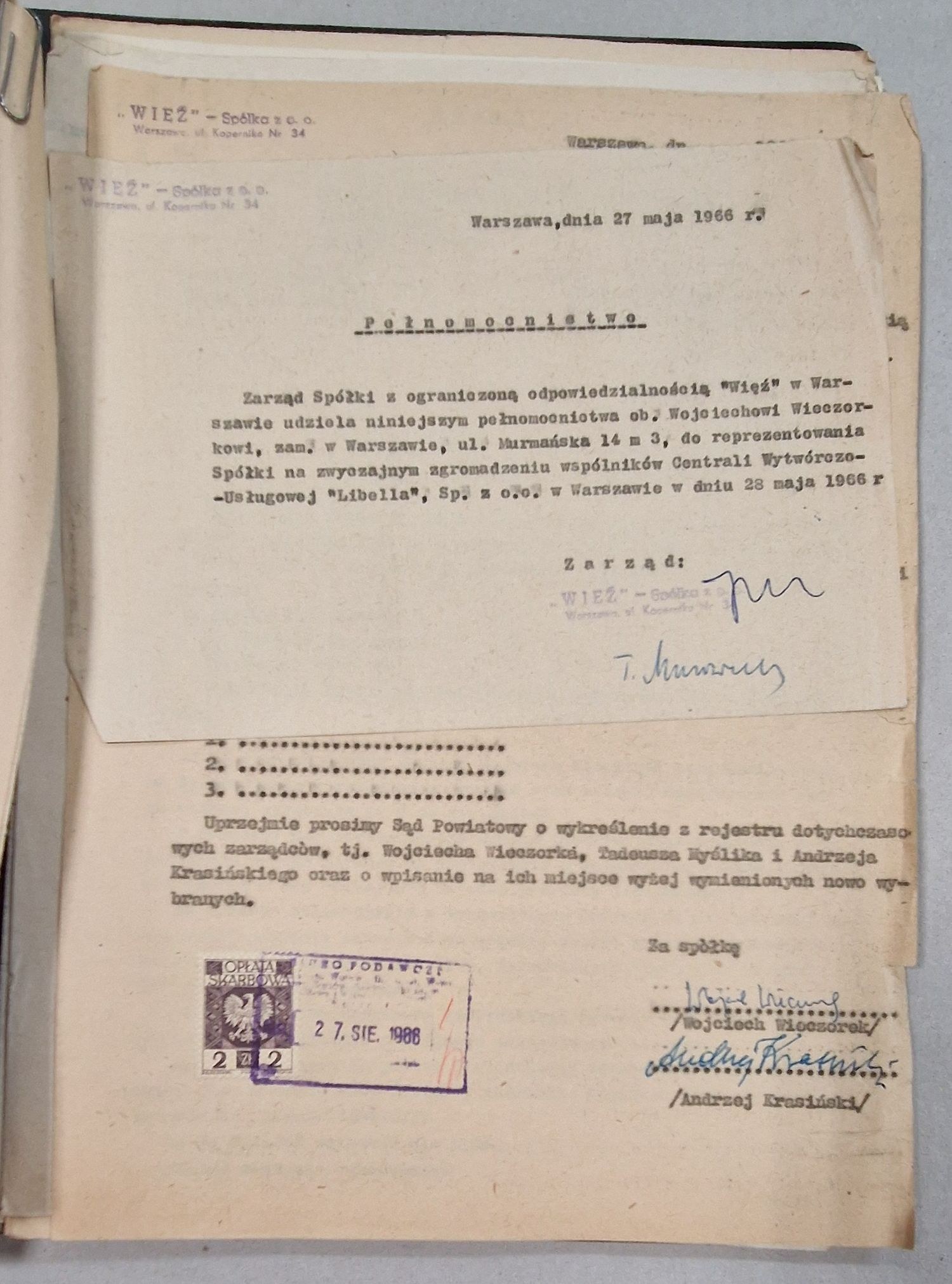 - arkusik z pełnomocnictwem (kopia przez kalkę, z odręcznymi podpisami), na papierze opieczętowanym „Wieź” - Spółka z o.o. Warszawa, ul. Kopernika Nr 34, z 27 maja 1966, upoważniająca Wojciecha Wieczorka reprezentowania wydawnictwa „Więź” na zwyczajnym zgromadzeniu wspólników Centrali Wytwórczo-Usługowej „Libella” sp. z o.o. W Warszawie, w dniu 28 maja 1966. Podpisali członkowie zarządu „Więzi” - Tadeusz Mazowiecki i Janusz Zabłocki. Verso dopisek z prośbą o pilne przekazanie tegoż upoważnienia.