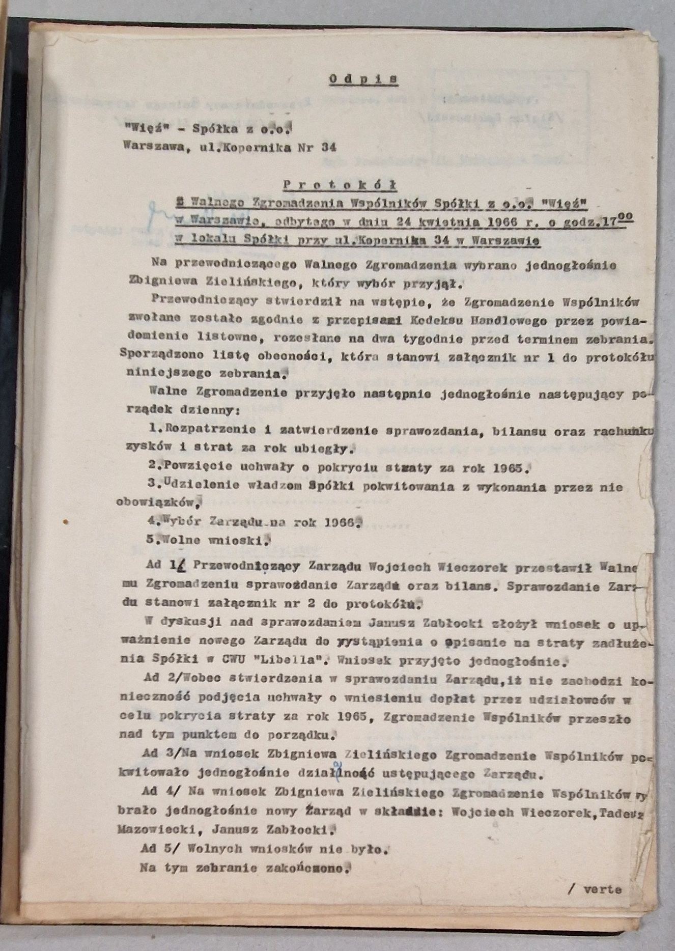 - 2 arkusze, list zaadresowany „Do Sądu Powiatowego dla Warszawy-Pragi w Warszawie, ze Zgłoszeniem zmiany członków Zarządu spółki „Więź - spółka z ograniczoną odpowiedzialnością” (oznaczenie katalogowe rejestru to samo, data złożenia w urzędzie 27.sie.1966), nowymi członkami Zarządu zostali Wojciech Wieczorek, Tadeusz Mazowiecki, Janusz Zabłocki, dołączono 2 str. odpis Protokołu Walnego Zgromadzenia Wspólników z 24 kwietnia 1966. Podpis Wojciecha Wieczorka (2x?) i Andrzeja Krasińskiego.