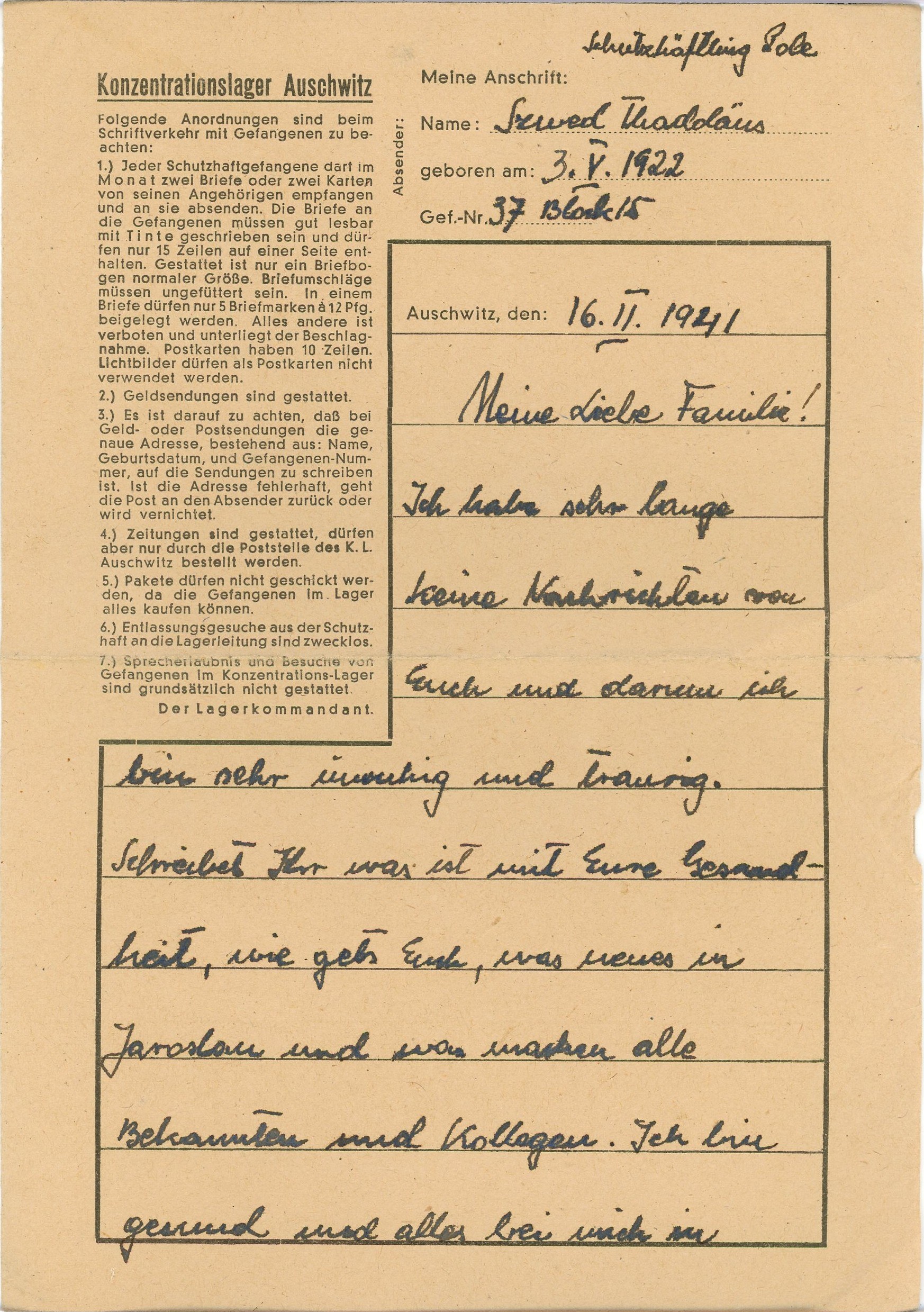 Pierwszy masowy transport do Auschwitz – transport więźniów z zakładu karnego w Tarnowie, który w dniu 14 czerwca 1940 został skierowany przez okupantów niemieckich do nowo otwartego obozu koncentracyjnego Auschwitz. Z tarnowskiego więzienia do KL Auschwitz dotarło 728 więźniów. Numer 31 (pierwsze 30 numerów otrzymali niemieccy kryminaliści z KL Sachsenhausen), otwierający rejestr więźniów politycznych KL Auschwitz, otrzymał Stanisław Ryniak (przywieziony do Tarnowa z Jarosławia), a zamykający numer 758 – Ignacy Płachta z Łodzi. Oferowany list (i dwa inne na naszej aukcji) były pisane przez więźnia nr 37 - Tadeusza Szweda.