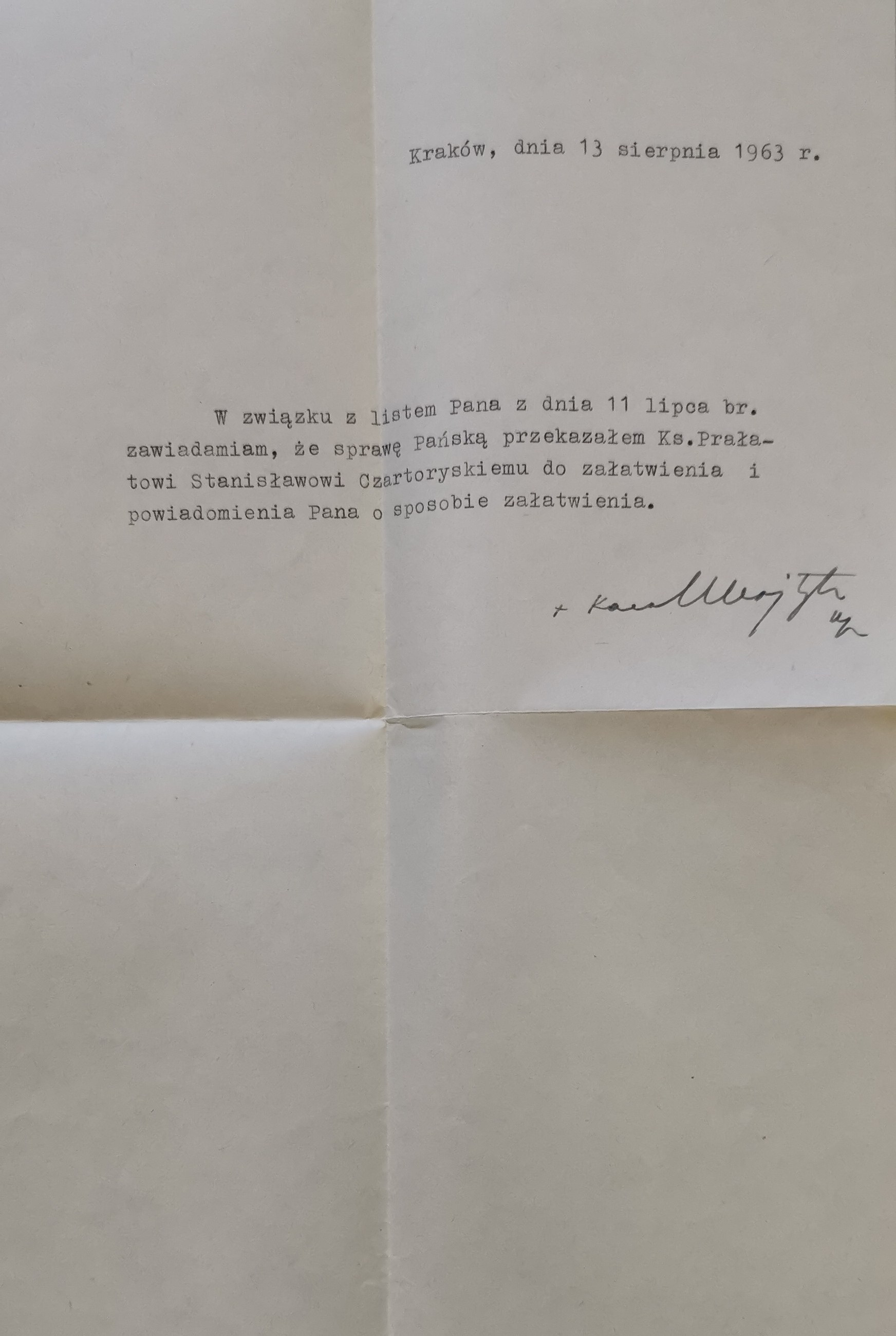 c) 1 stronicowy list na arkuszu 29,8 x 21,2 cm, Stan bardzo dobry: złożenie w pionie i poziomie. Zapewne odpowiedź na w.w. list: „Kraków, dnia 13 sierpnia 1963 r. W związku z listem Pana z dnia 11 lipca br. zawiadamiam, że sprawę Pańską przekazałem Ks. Prałatowi Stanisławowi Czartoryskiemu do załatwienia i powiadomienia Pana o sposobie załatwienia.” [podpisano odręcznie] Karol Wojtyła.