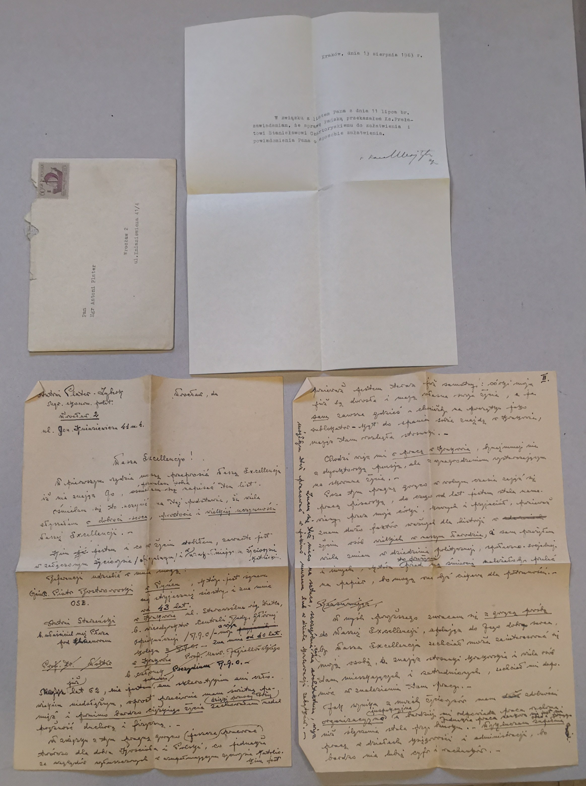 W zestawie 3 obiekty: koperta, 4 str. list (kopia? z naniesionymi poprawkami, bez daty) Antoniego Potockiego do Excellencji [niewymienionego z nazwiska - Karola Wojtyły, biskupa krakowskiego] i odpowiedź biskupa Wojtyły z 13 sierpnia 1963 r.