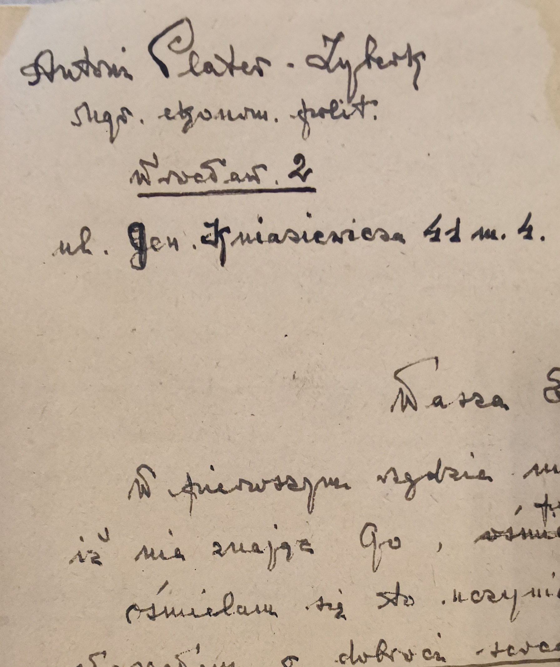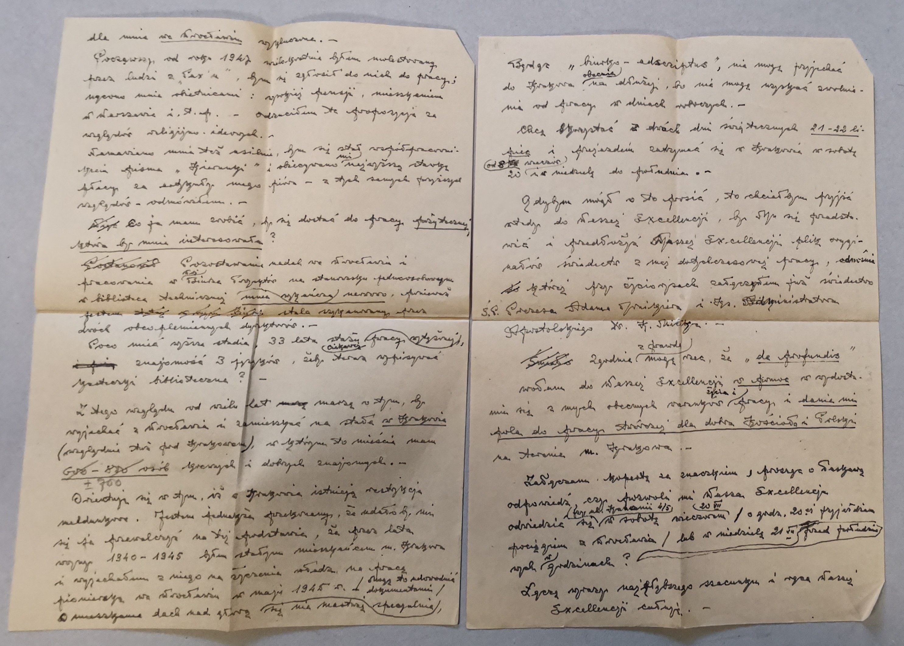 b) 4-stronicowy list (kopia/brudnopis? z odręcznymi dopiskami, poprawkami, być może poprawiony wysłał ok 11 lipca, a tę kopię zachował ku pamięci?) na dwóch arkuszach 29,9 x 21 cm, od Antoniego Plater-Zyberka (data niewypełniona), zaadresowany do biskupa Karola Wojtyły [nie wymienia imienia i nazwiska adresata], którego tytułuje „Wasza Excellencjo! ...”. Być może na powielaczu skopiował list, który wysyłał do różnych osób, które mogłyby mu pomóc, na ten egzemplarz naniósł poprawki, które dostosował do konkretnego adresata, oryginał wysłał, a ten brudnopis zachował.