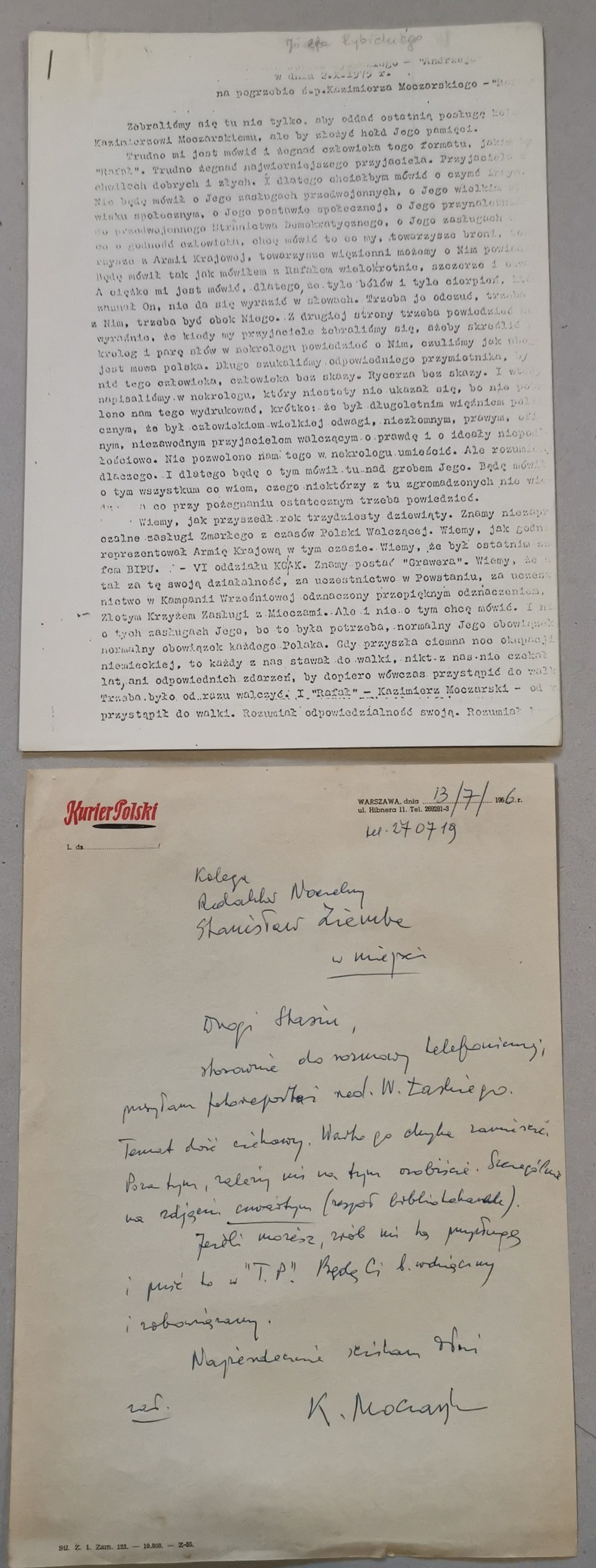 Zestaw 2 pozycji: list Kazimierza Moczarskiego z 1966 roku do redaktora Stanisława Ziemby, z odręcznym podpisem autora; powielaczowa kopia przemówienia Józefa Rybickiego na pogrzebie Kazimierza Moczarskiego w dniu 2.X.1975.