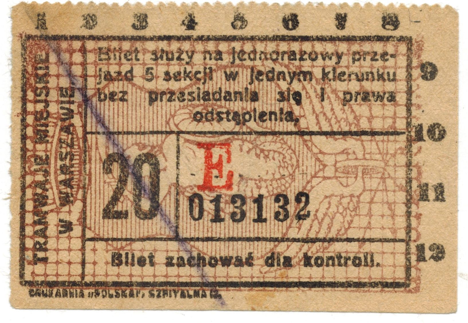 Tramwaje Miejskie w Warszawie. Bilet służy na jednorazowy przejazd 5 sekcji w jednym kierunku bez przesiadania się i prawa prawa odstąpienia. Druk.: Drukarnia Polska, Warszawa, Szpitalna 12. Format 4,8 x 6,6 cm.