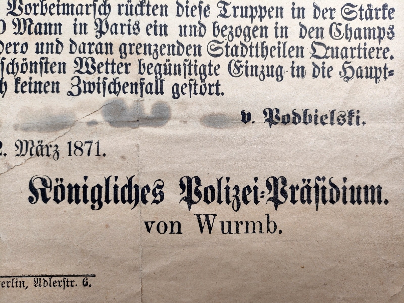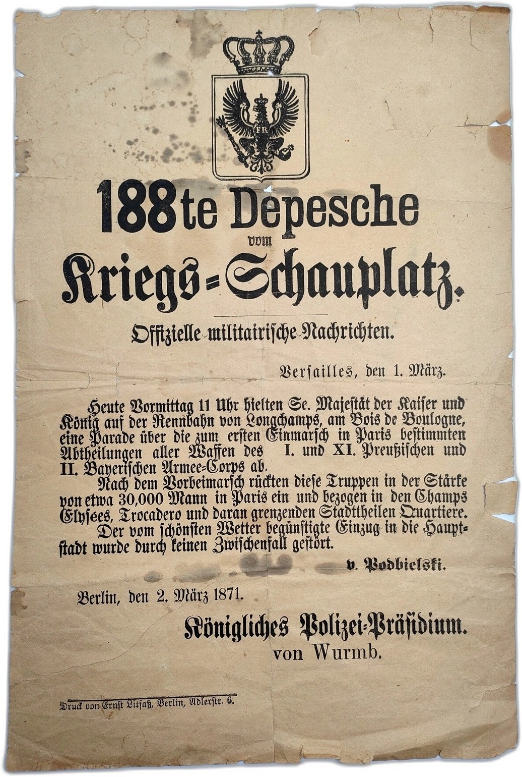 Druk ulotny wydany w Berlinie 2 marca 1871 informujący o dotarciu armii cesarskiej i jej zatrzymaniu się na torze wyścigowym Longchamps, w Bois de Boulogne, dołączeniu do Armii 30 000 mężczyzn oraz przemarszu w tej sile do Paryża na Pola Elizejskie.
