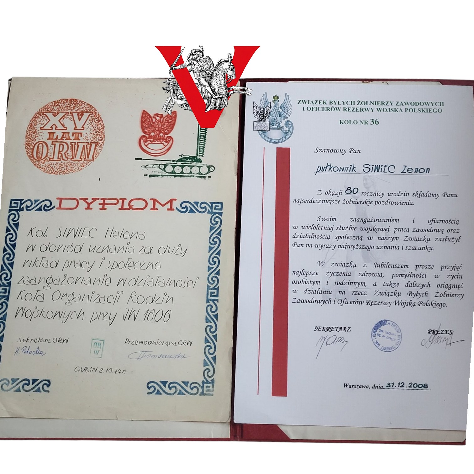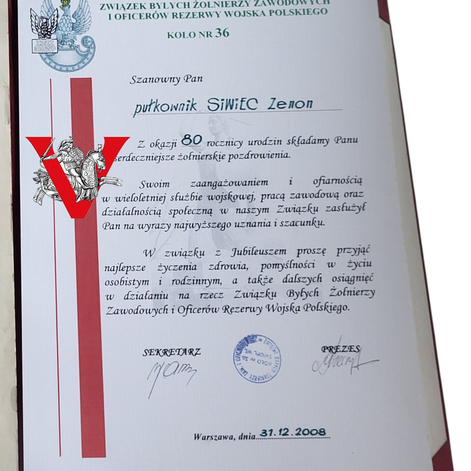2️⃣ Pismo gratulacyjne dla pułkownika Zenona Siwca z okazji 80. rocznicy urodzin, wystosowane przez Związek Byłych Żołnierzy Zawodowych i Oficerów Rezerwy Wojska Polskiego, Koło nr 36 (Warszawa, 31.12.2008 r.).