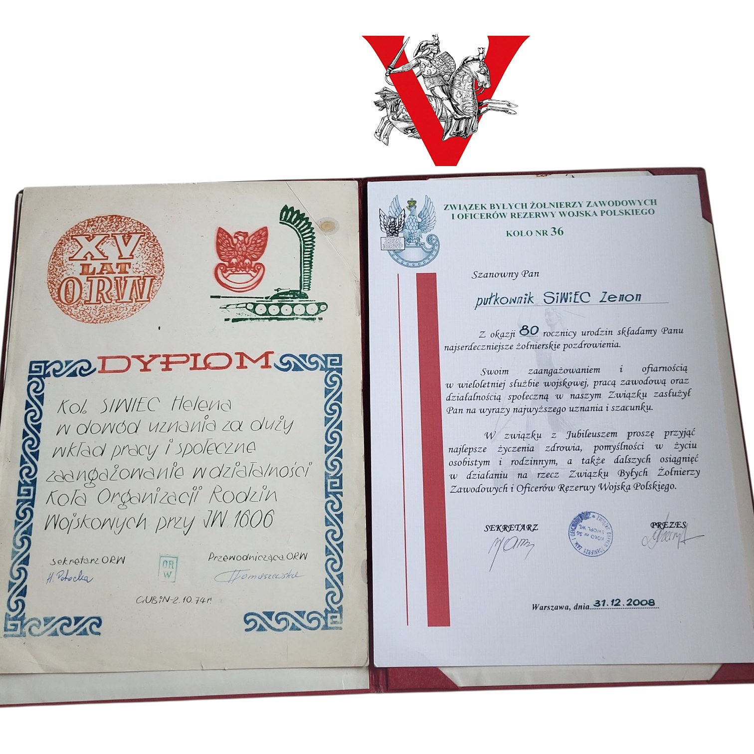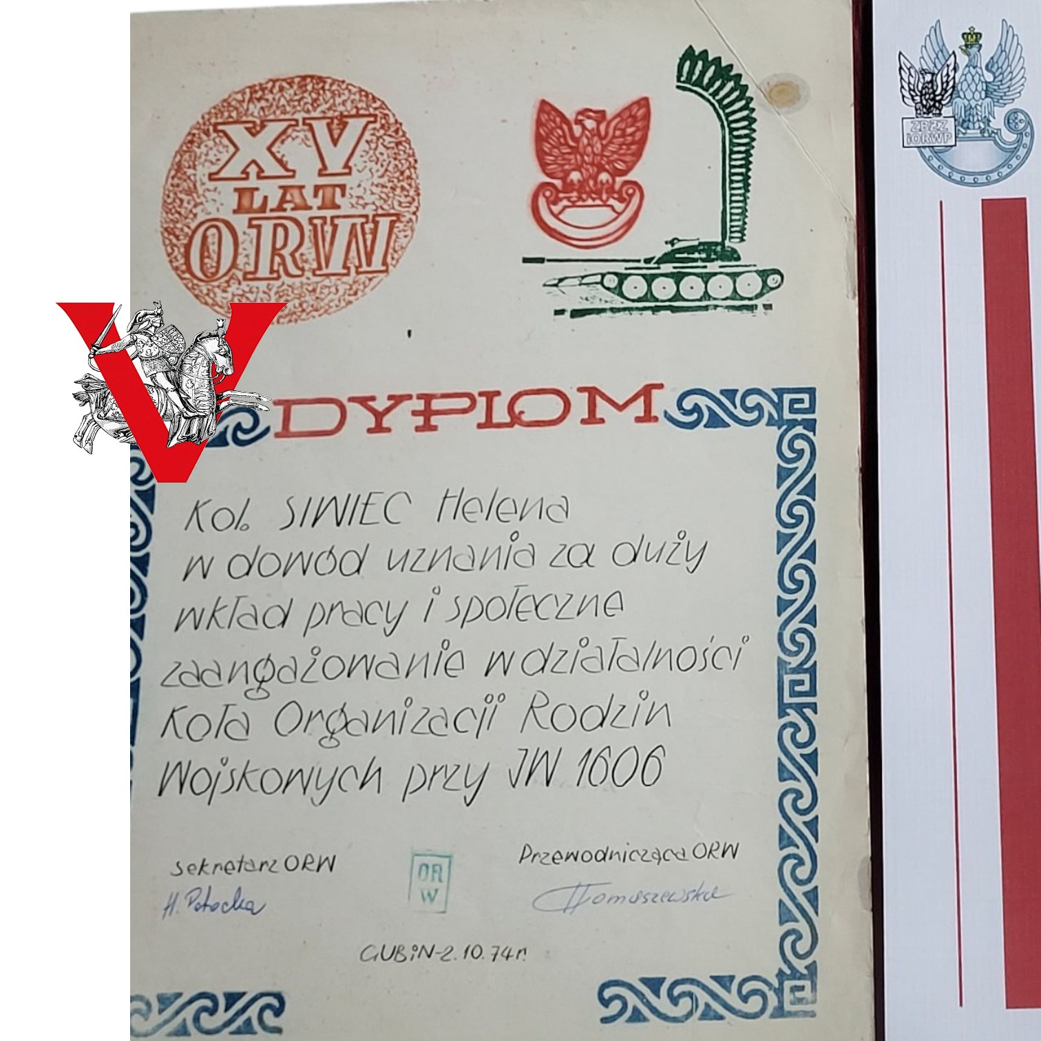 1️⃣ Dyplom wystawiony dla Heleny Siwiec przez Koło Organizacji Rodzin Wojskowych przy JW 1060 z okazji XV-lecia ORW, w dowód uznania za duży wkład pracy i społeczne zaangażowanie (Gubin, 2.10.1974 r.).
