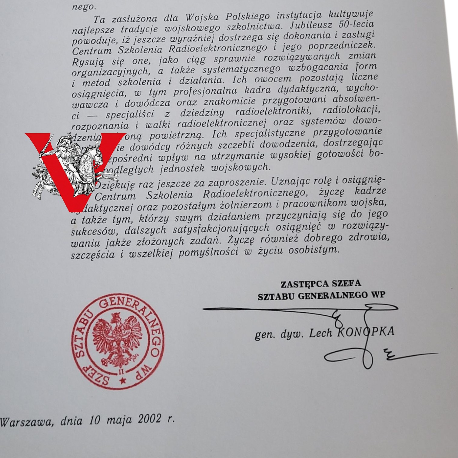 Pismo wyraża uznanie dla zasług i wkładu Centrum Szkolenia Radioelektronicznego w rozwój wojsk radiolokacyjnych i radioelektronicznych, z okazji obchodów 50-lecia jednostki.