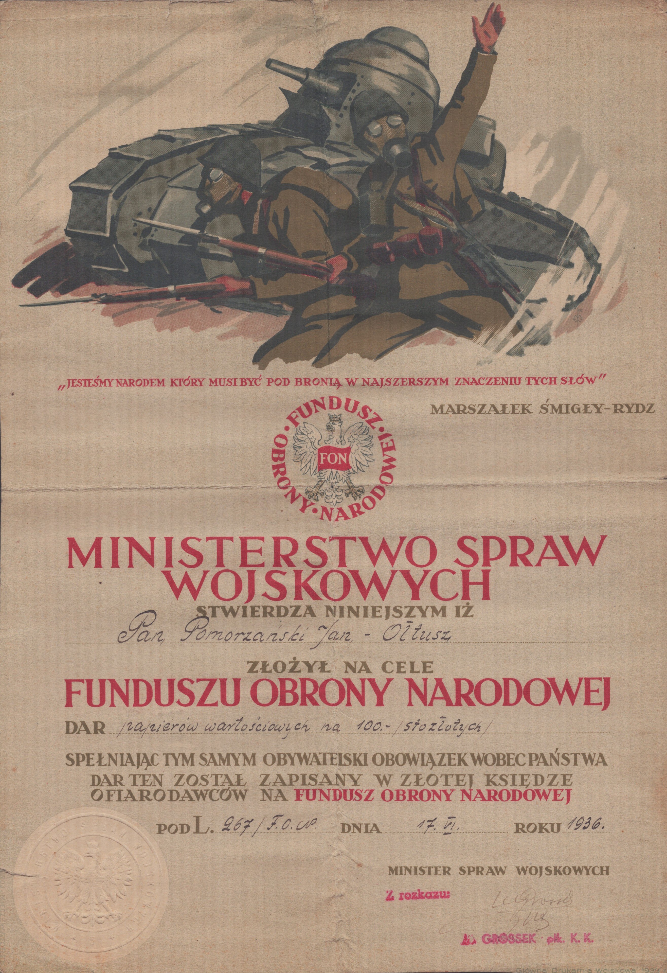 FUNDUSZ OBRONY NARODOWEJ, MINISTERSTWO SPRAW WOJSKOWYCH] Dyplom potwierdzający złożenie daru na cele Funduszu Obrony Narodowej z dnia 17 VI 1936 r. dla p. Jana Oltusz-Pomorzańskiego.