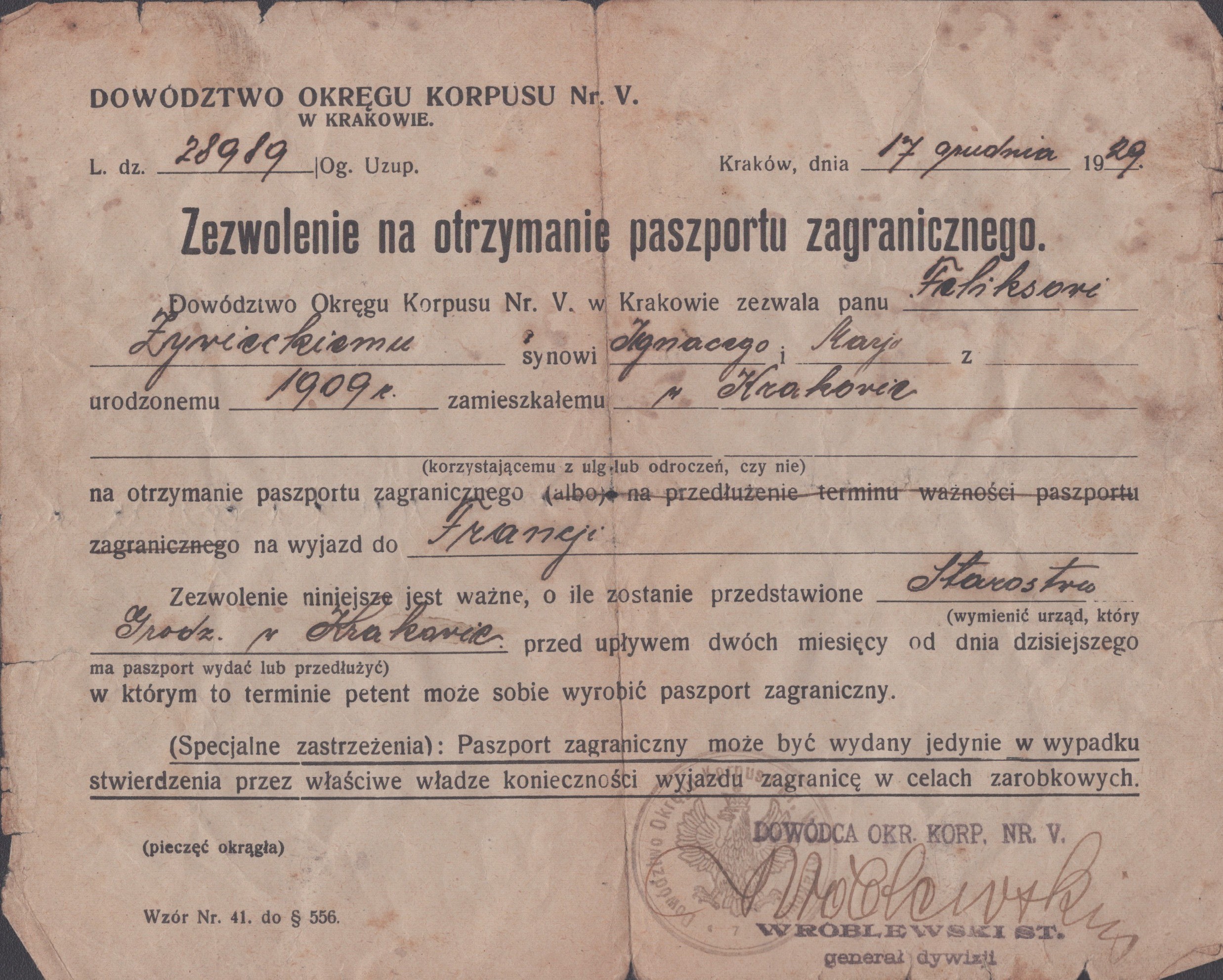 GEN. WRÓBLEWSKI Stanisław, autograf] Dowództwo okręgu Korpusu Nr. V. w Krakowie. Zezwolenie na otrzymanie paszportu zagranicznego dla Feliksa Żywieckiego. 17 XII 1929 r.