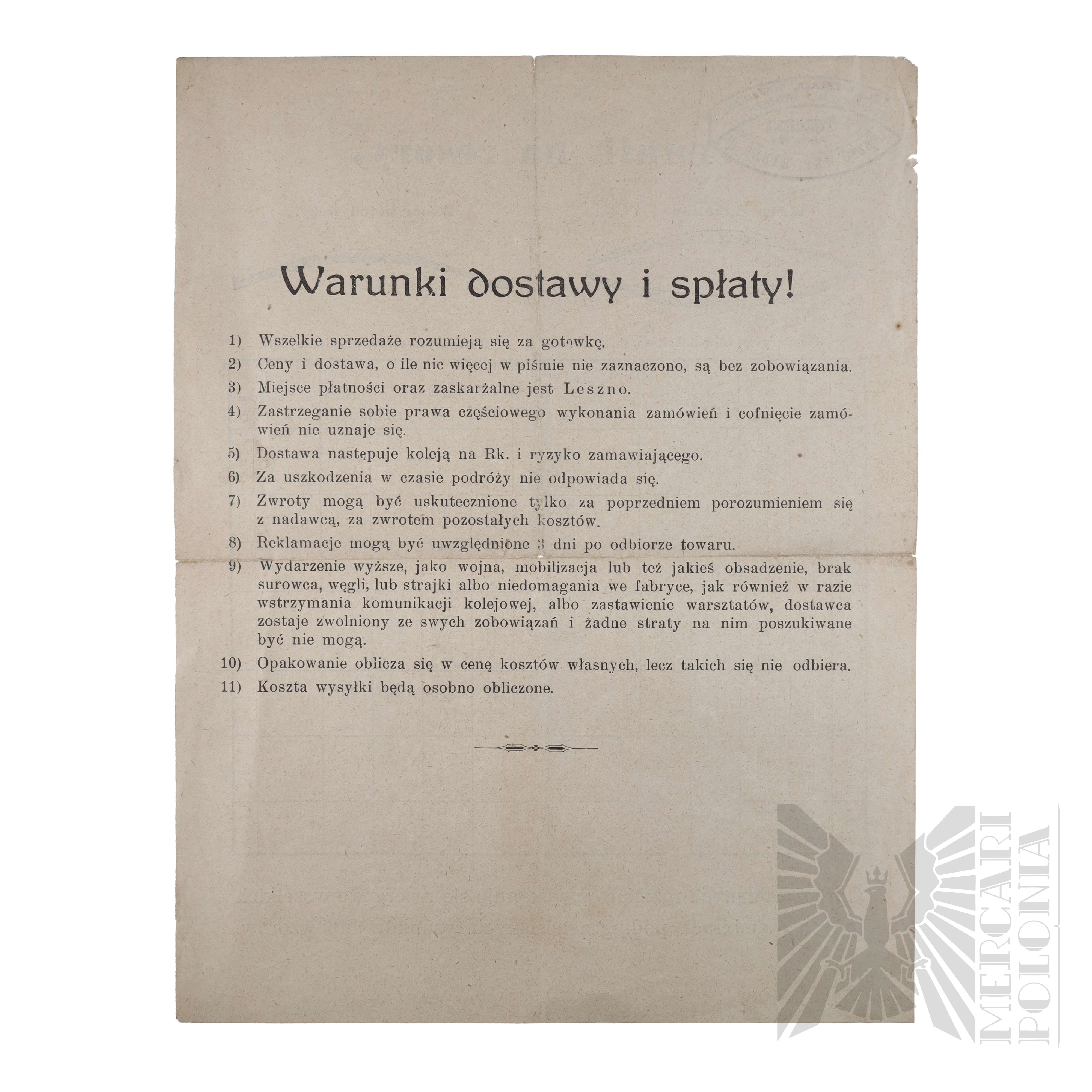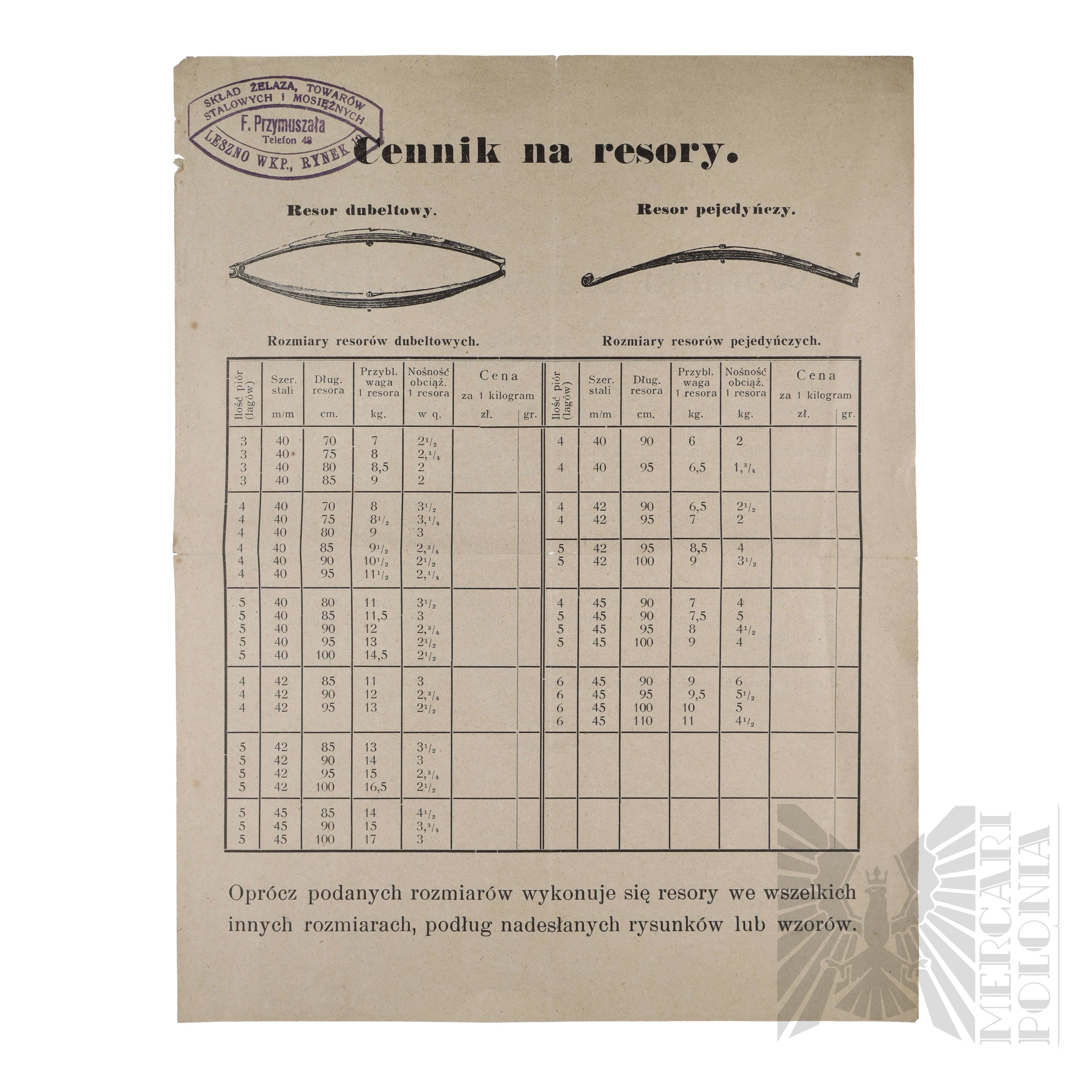 II RP - Cennik na Resory Skład Żelaza, Towarów Stalowych i Mosiężnych F. Przymuszała, Leszno Wielkopolskie